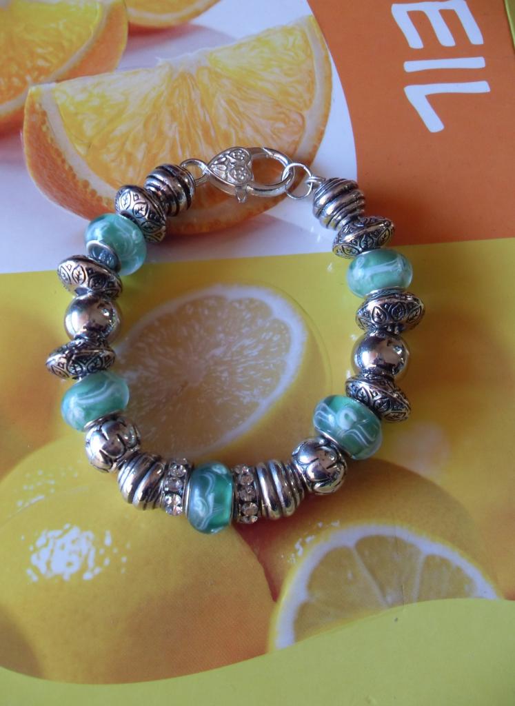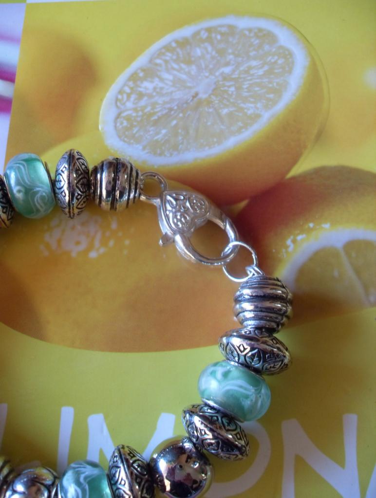 Bracelet de perles vertes et agentées, perles lampwork, résine, métal et strass. Et son fermoir mousqueton en métal argenté.