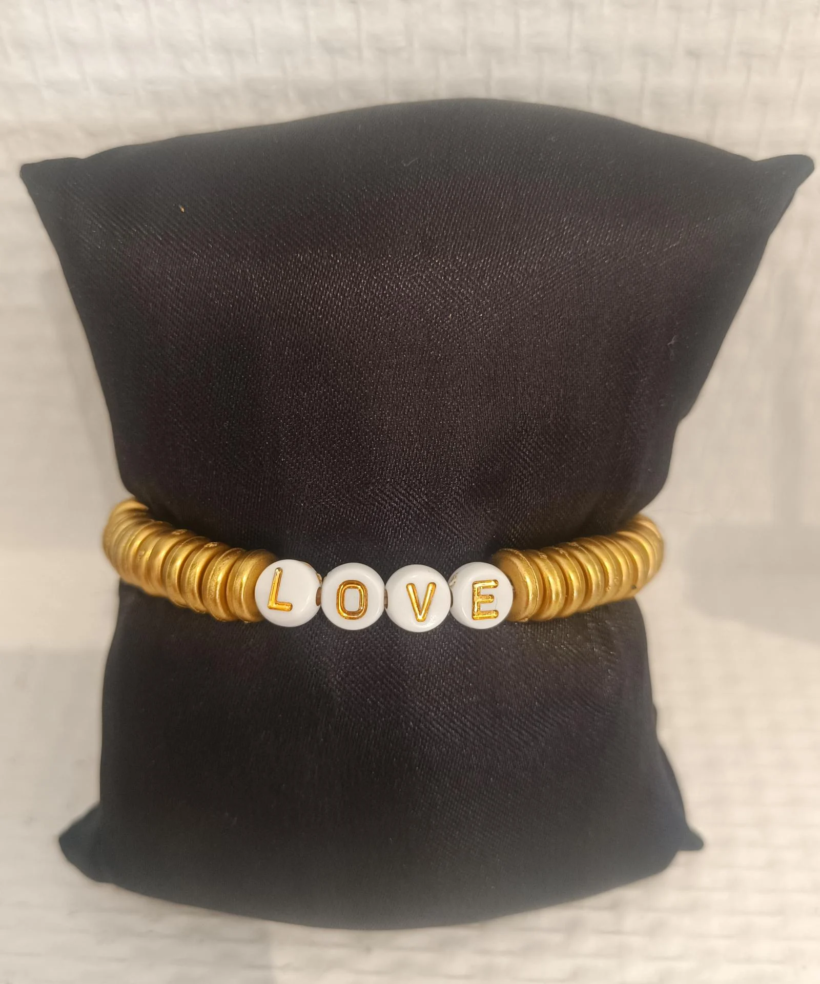 Bracelet perles rondelles heishi doré-blanc et lettres LOVE, élastiqué, Daphné...20.90€ TTC