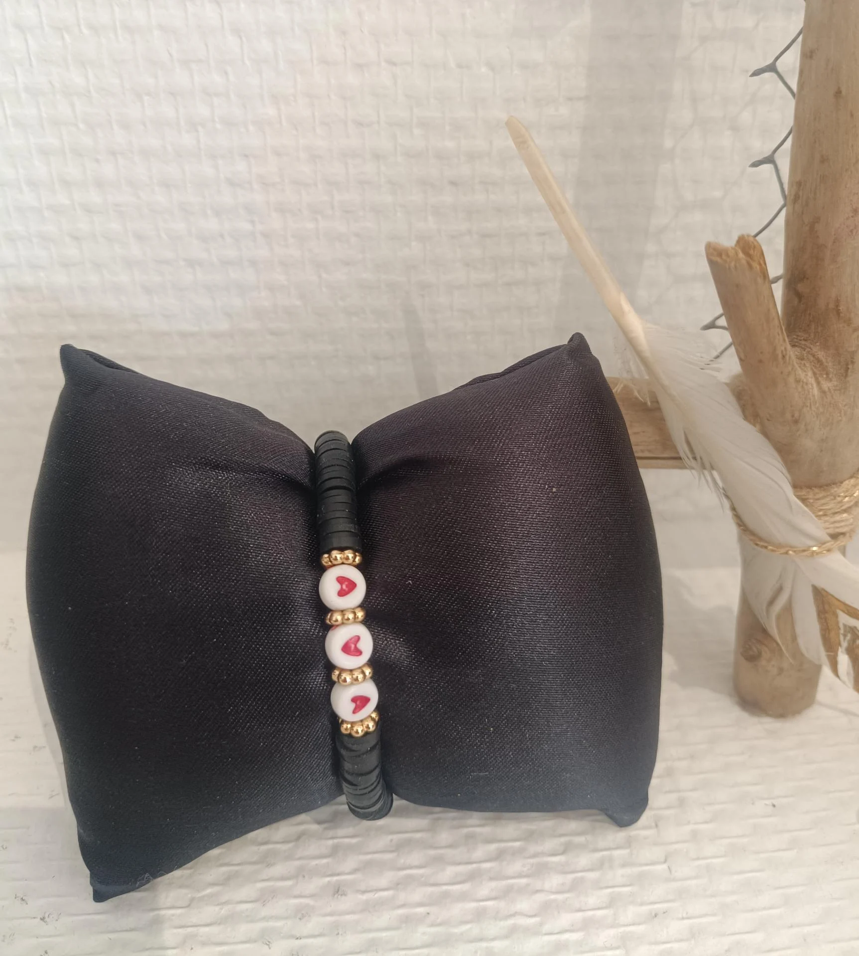 coeur blanc noir bracelet création artisanale résine élastiqué écru Daphné créations love perles heishi rondelles coquillage lettres amour