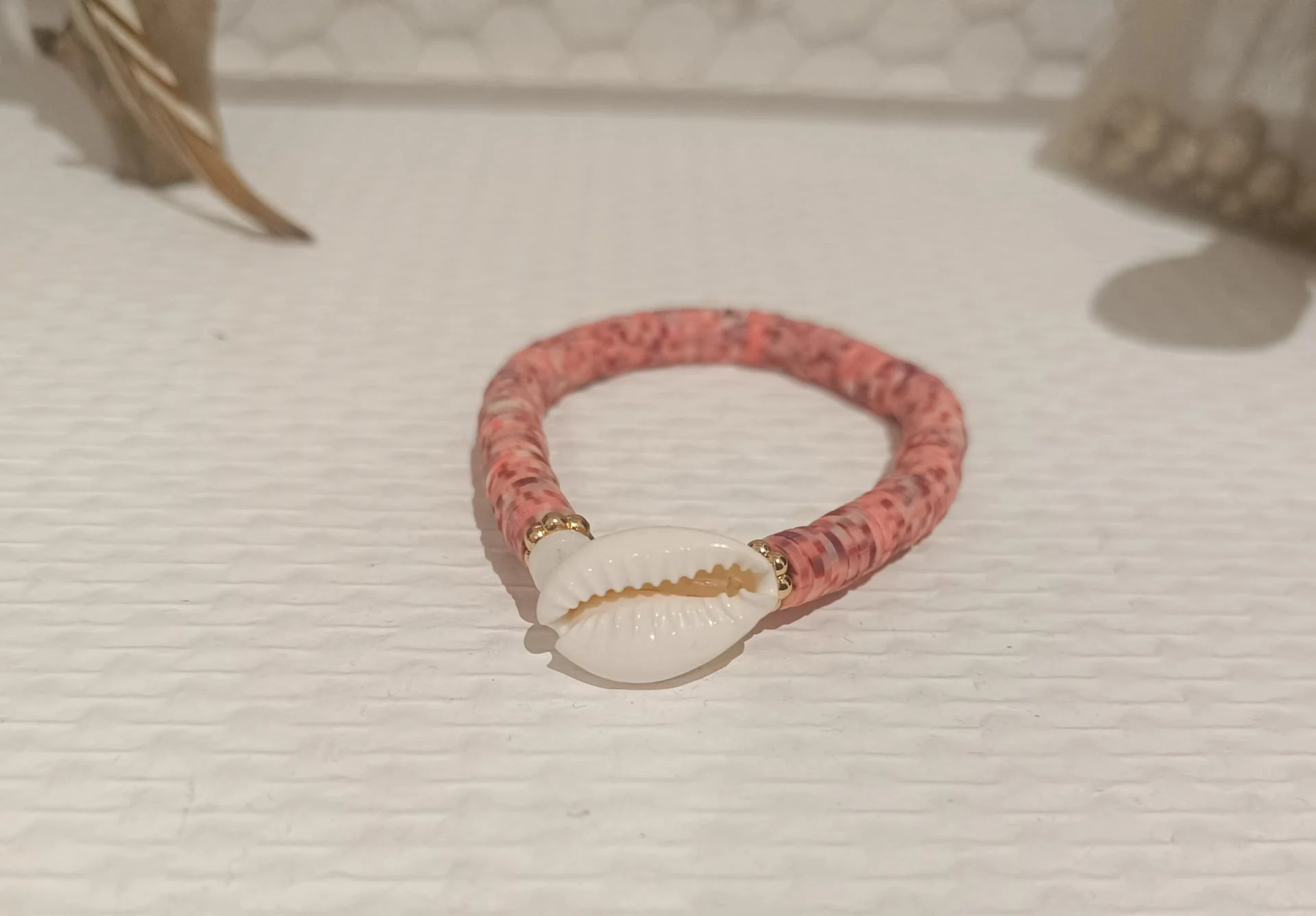 Bracelet perles rondelles heishi rose et coquillage.