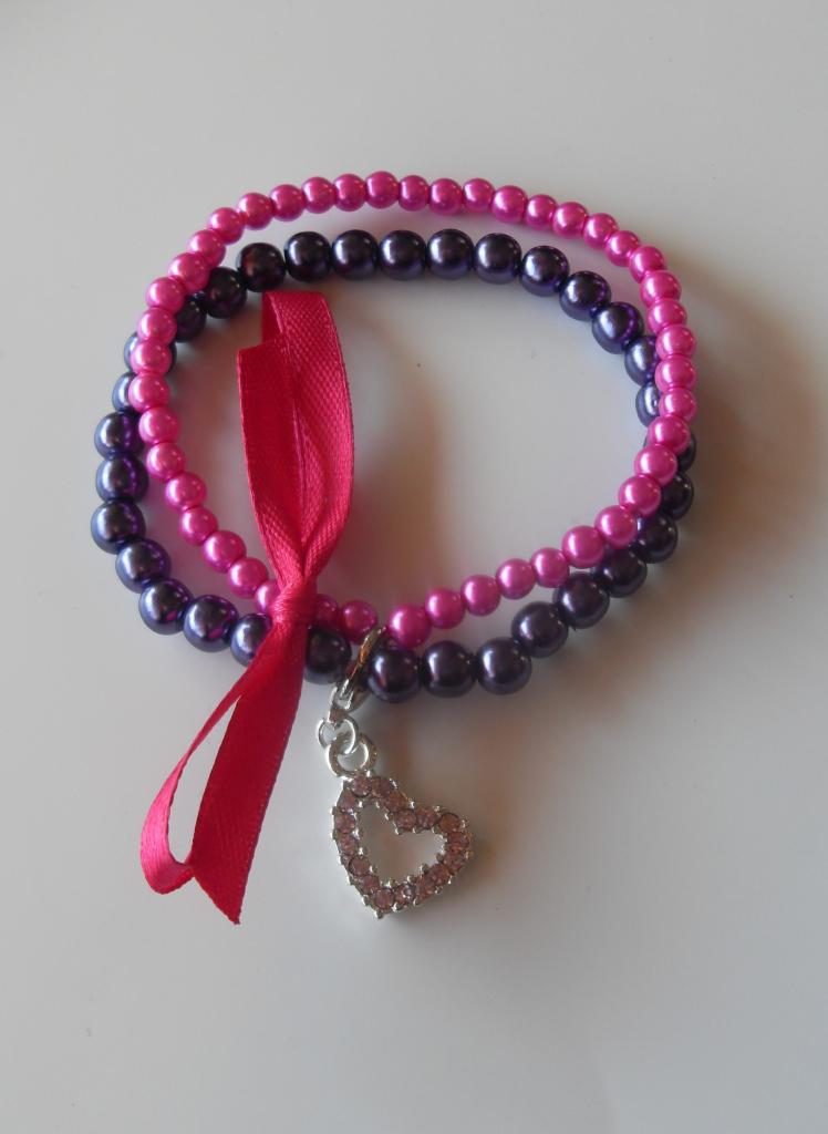 Bracelet perles rose fuschia et violet, ruban et son charm's coeur strass.