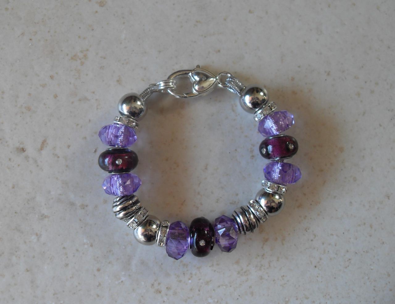 Bracelet de perles prune, violette et agentées, perles lampwork, résine, métal et strass. Et son fermoir mousqueton en métal argenté.