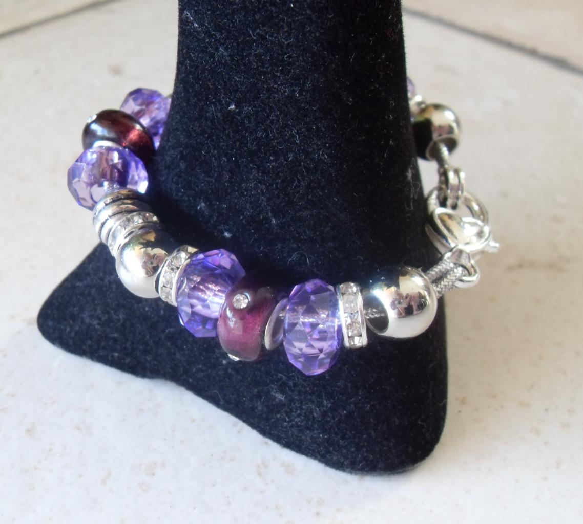 Bracelet prune, perles lampwork verre, métal, résine, strass et fermoir mousqueton argenté, création unique.