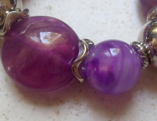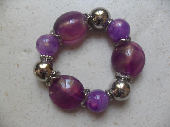 Bracelet élastiqué en perles résine violettes et métal.