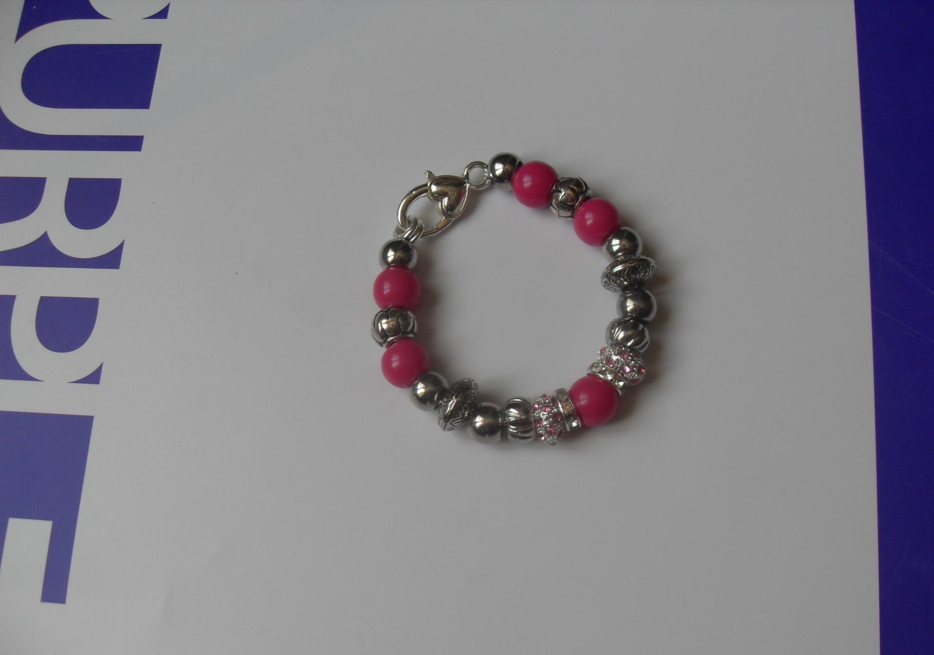 Bracelet rose, perles lampwork verre, métal, résine, strass et fermoir mousqueton argenté.