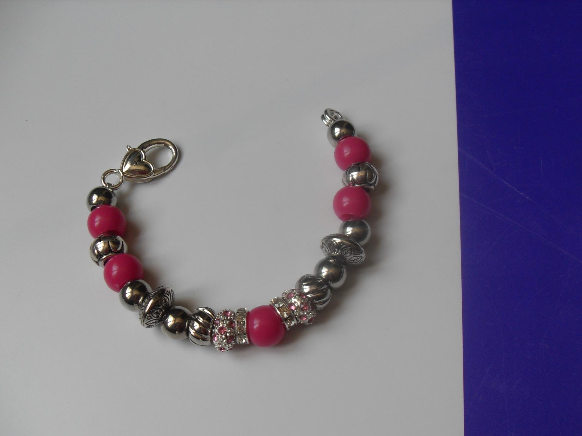 Bracelet rose, perles lampwork verre, métal, résine, strass et fermoir mousqueton argenté, création unique.