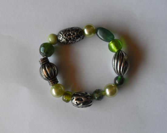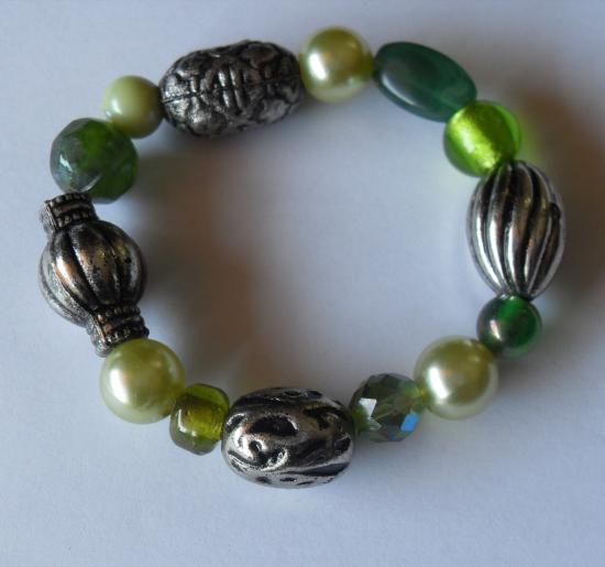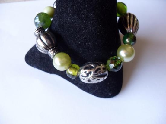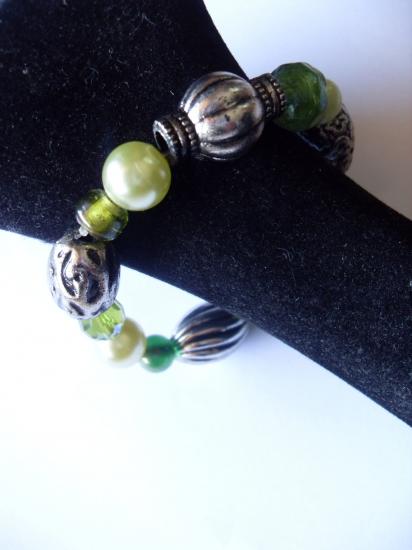 Bracelet perles de verre, résine et cristal dans les tons de vert et métal argenté.