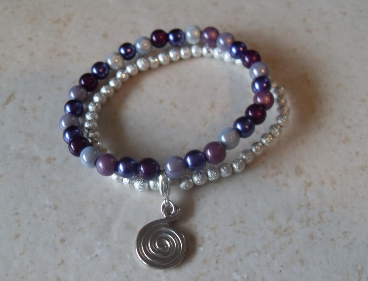 2 rangs de perles dans les tons de violet, mauve et perles argentées et son charm's rond spirale qui peut s'enlever grâce à son mousqueton.