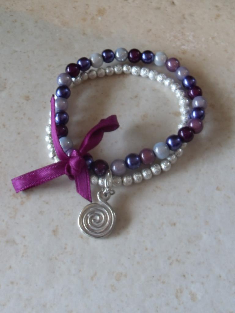 Bracelet violet-argenté perles , ruban et son charm's rond spirale.