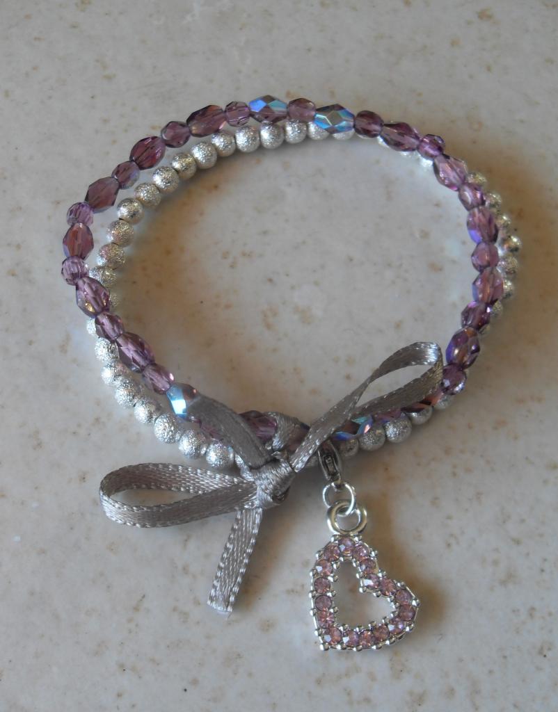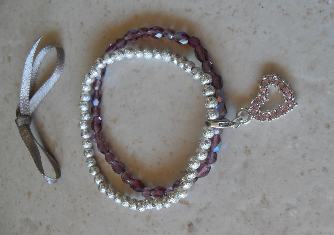 Bracelet violet-argenté perles swarovski, ruban et son charm's coeur strass.