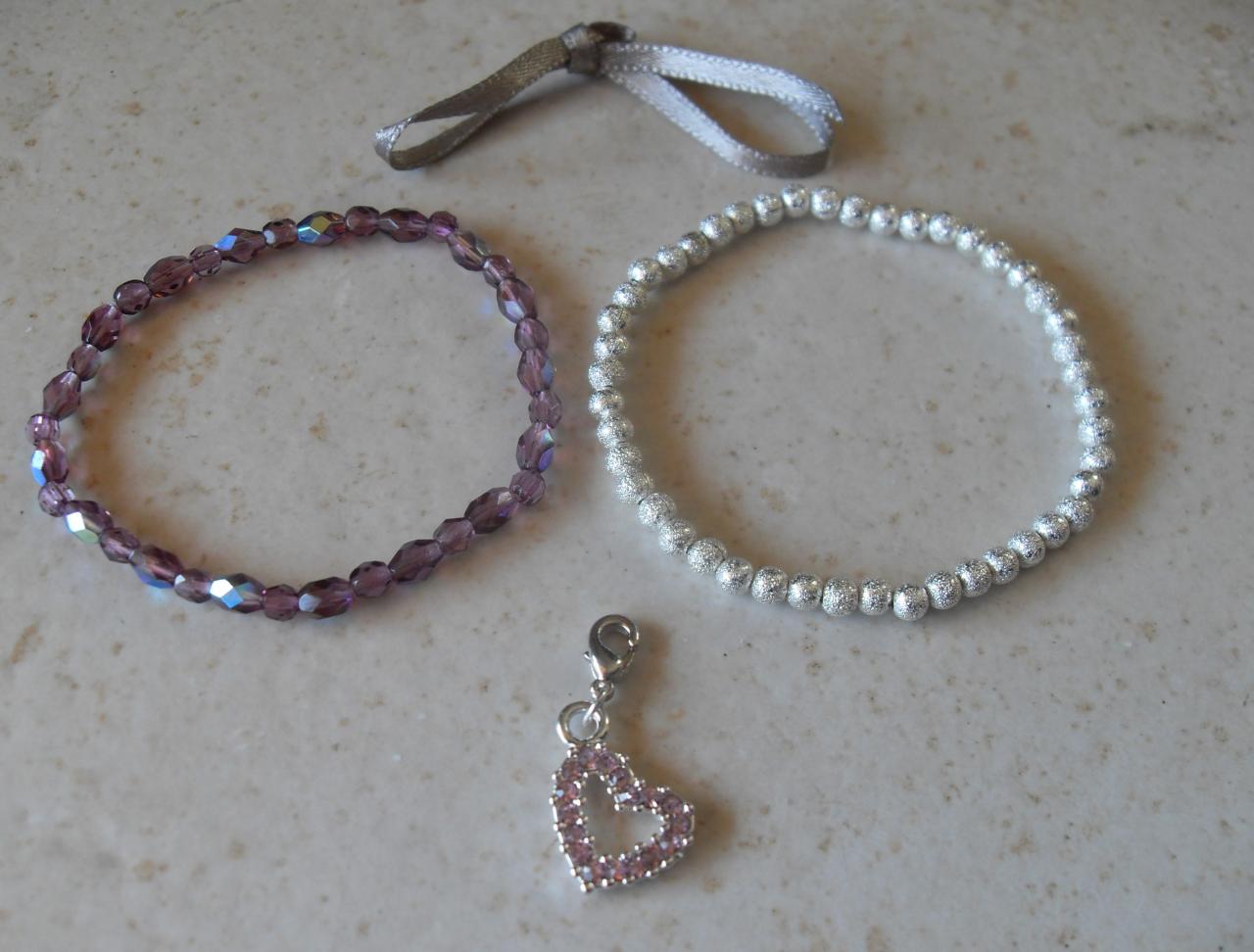 Bracelet violet-argenté perles swarovski, ruban et son charm's coeur strass, création unique, collection "les séparables"