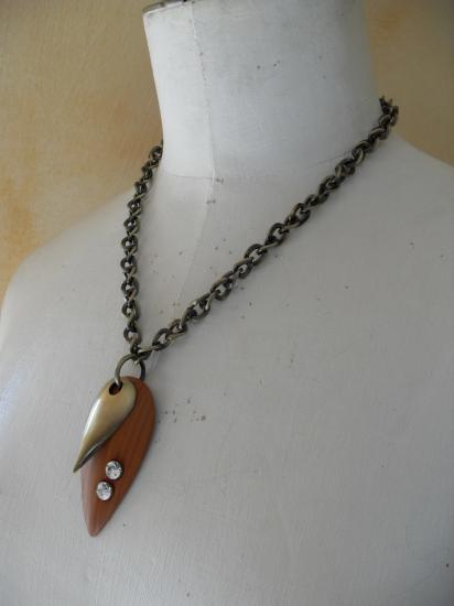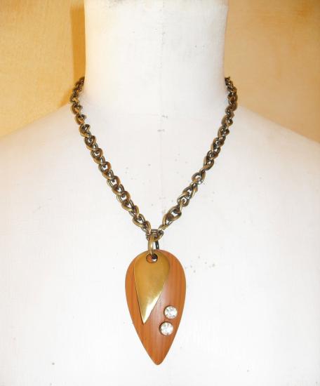 Collier chaîne bronze et pendentifs bois et strass.