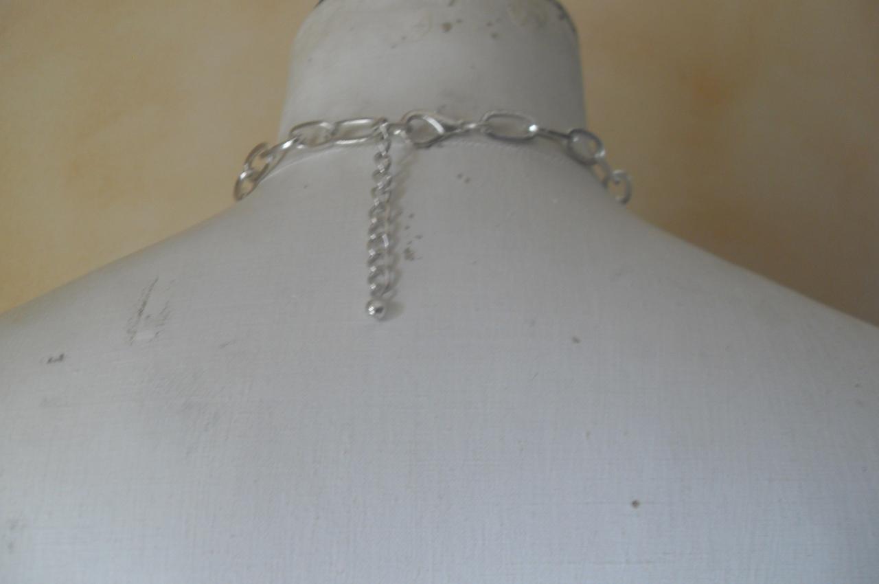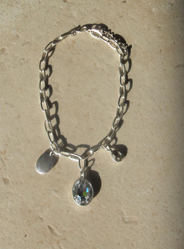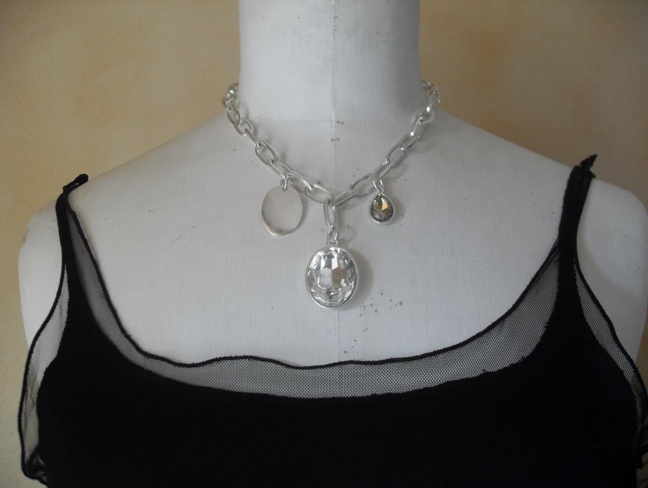 Collier gros maillons argentés, ses pampilles et son pendentif ovale en strass blanc.