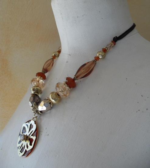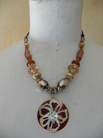 Collier de perles dans les tons de marrons et doré, pendantif rond, fleurs doré et strass.