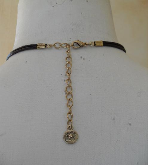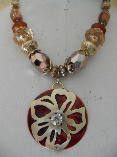 Collier marron,perles, pendentif rond, fleurs et strass.