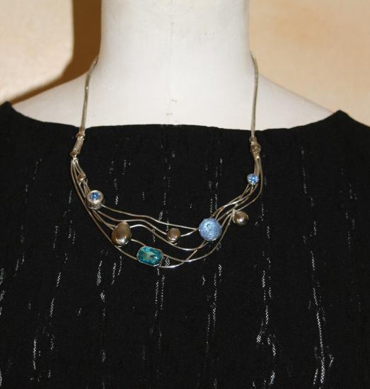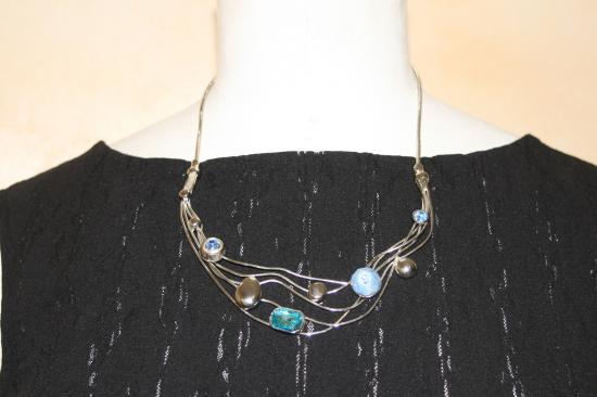 Collier multi-rangs en métal argenté, perles,strass et cabochons dans les tons de bleu.