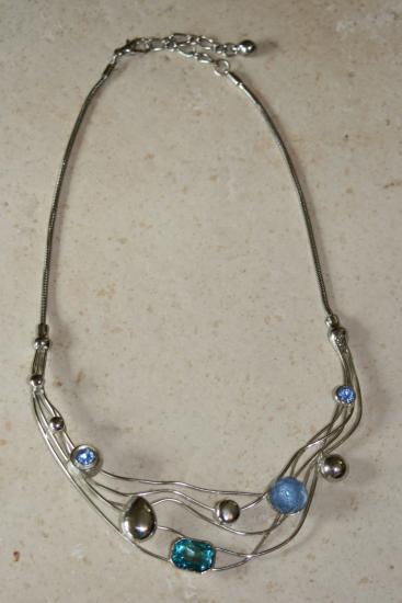 Collier multi-rangs, métal argenté strass et perles bleu.