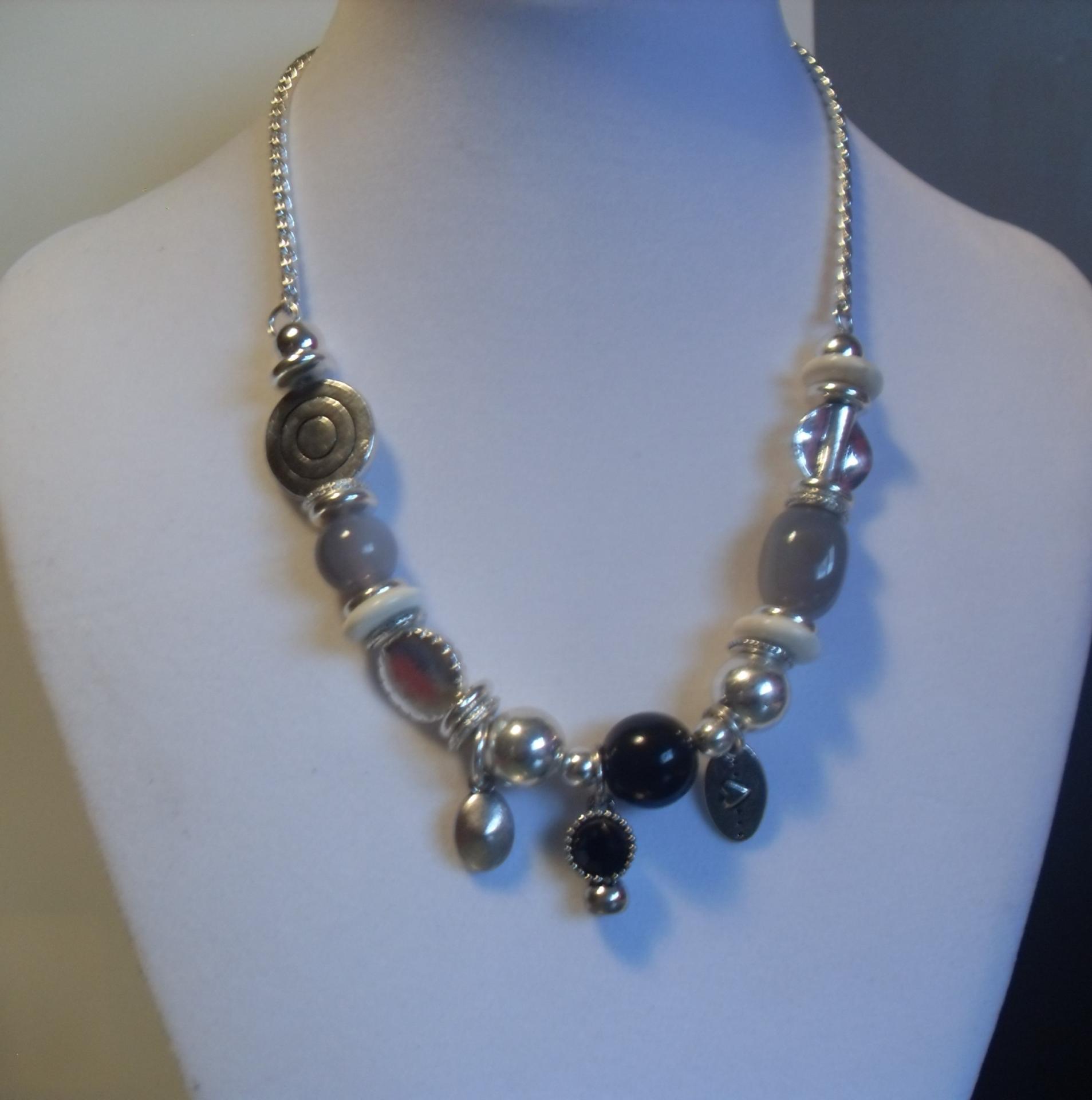 gris blanc noir pampilles métal argenté chaine perles Collier