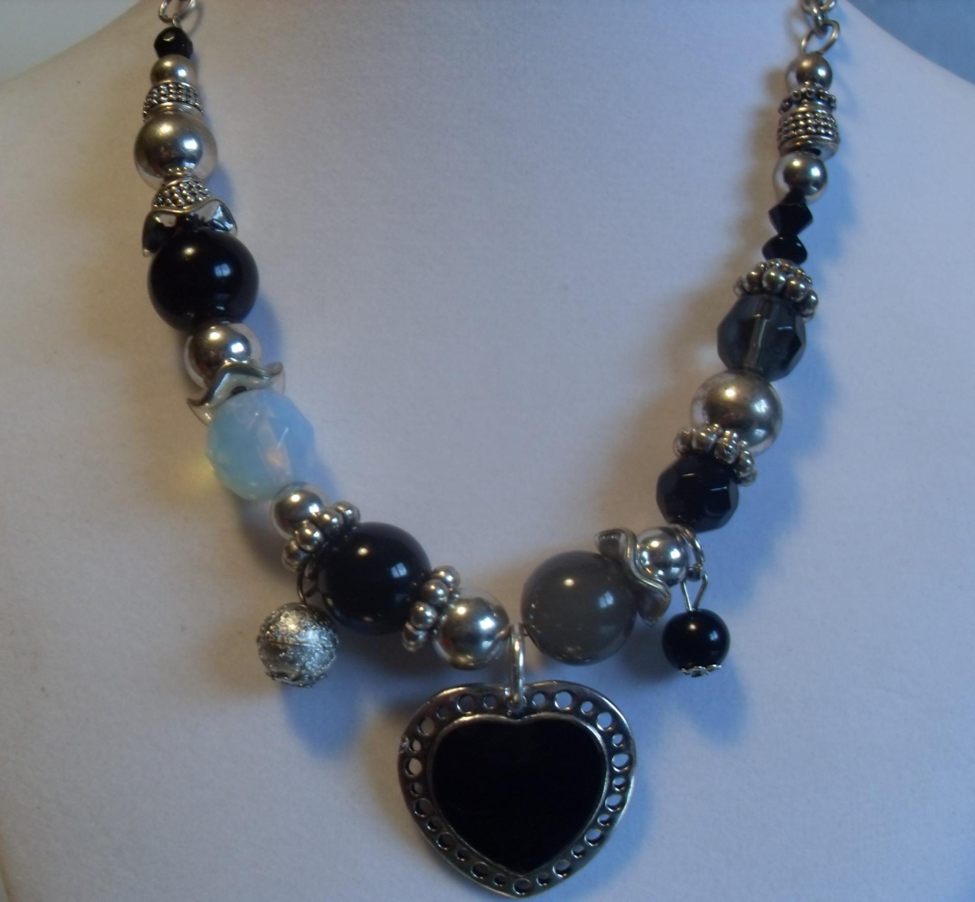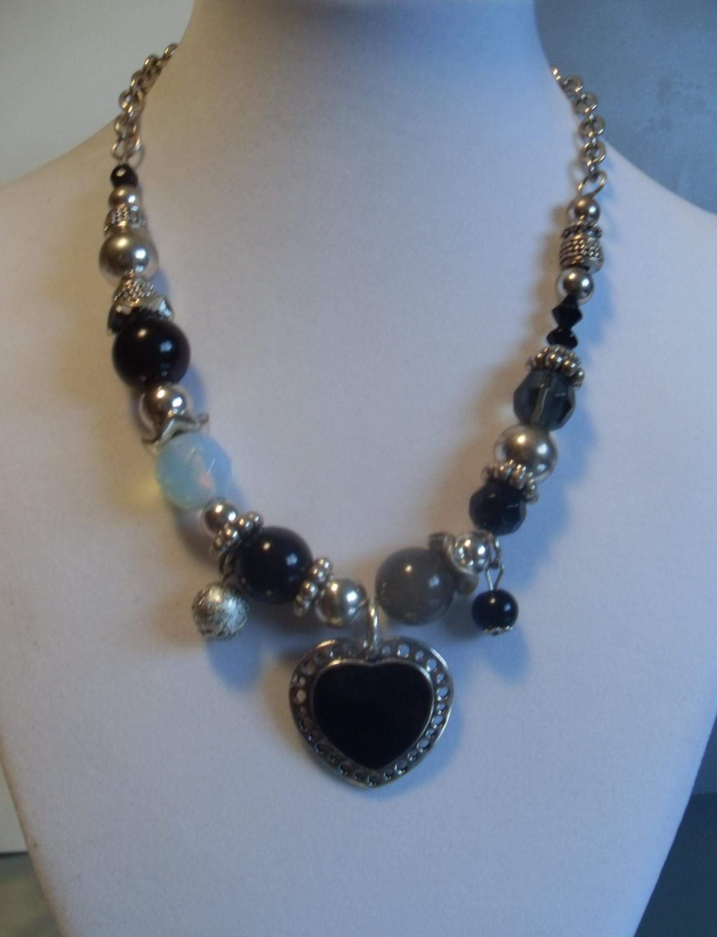Collier perles et métal argenté, gros coeur noir et pampilles.