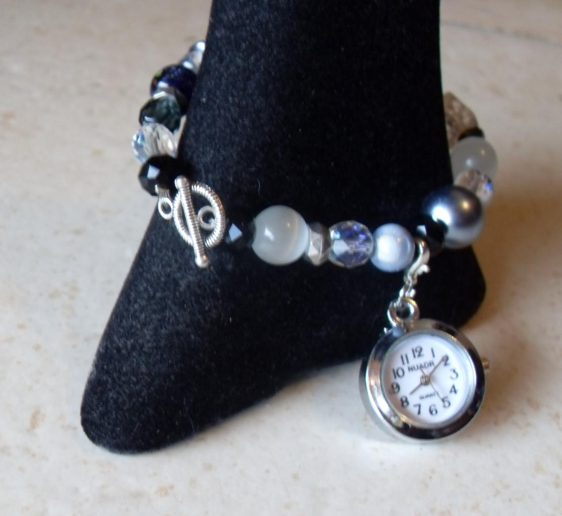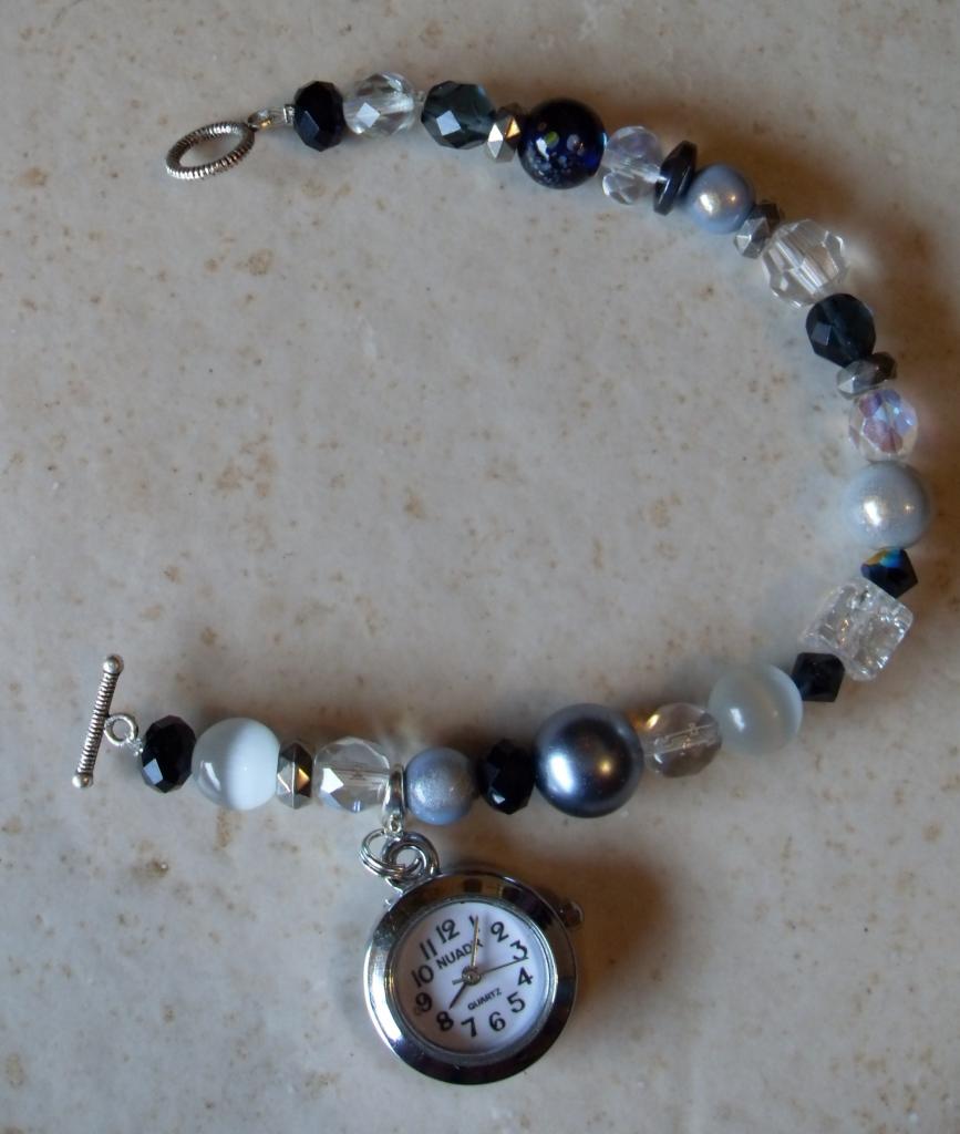 Bracelet en perles cristal de swarovski, verre, résine et son charm's montre qui permet de la mettre et l' enlever à volonté.