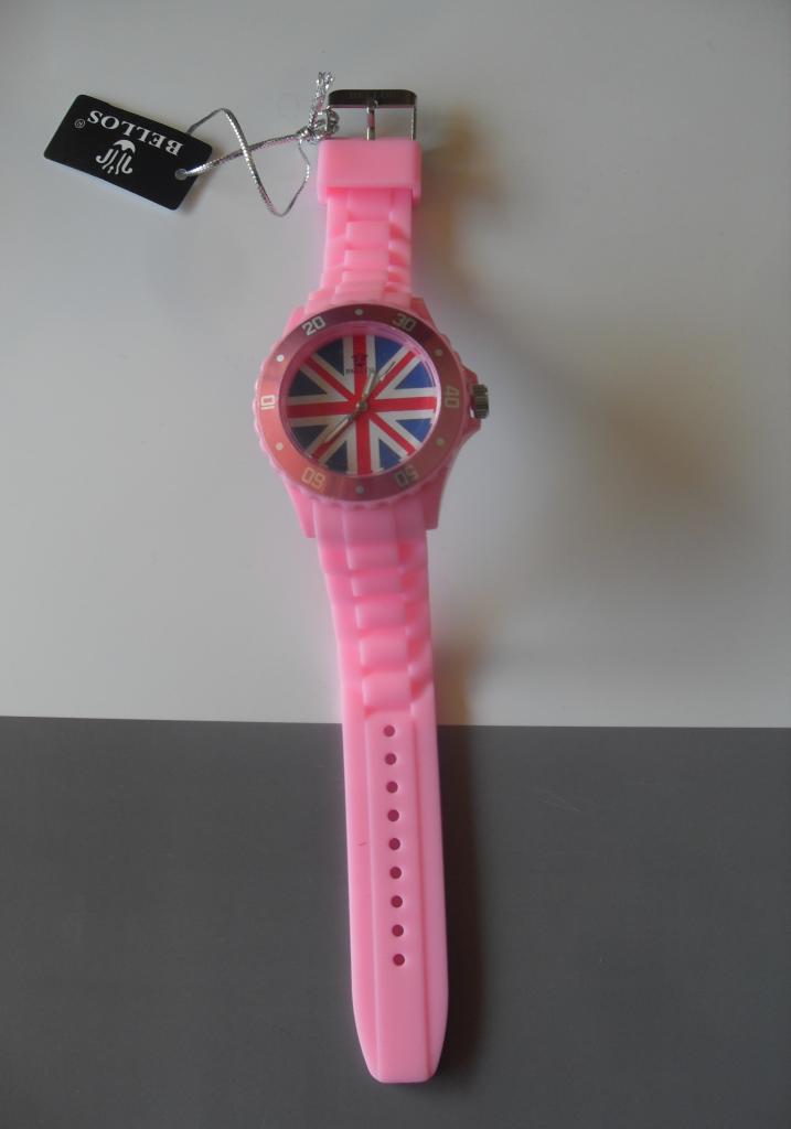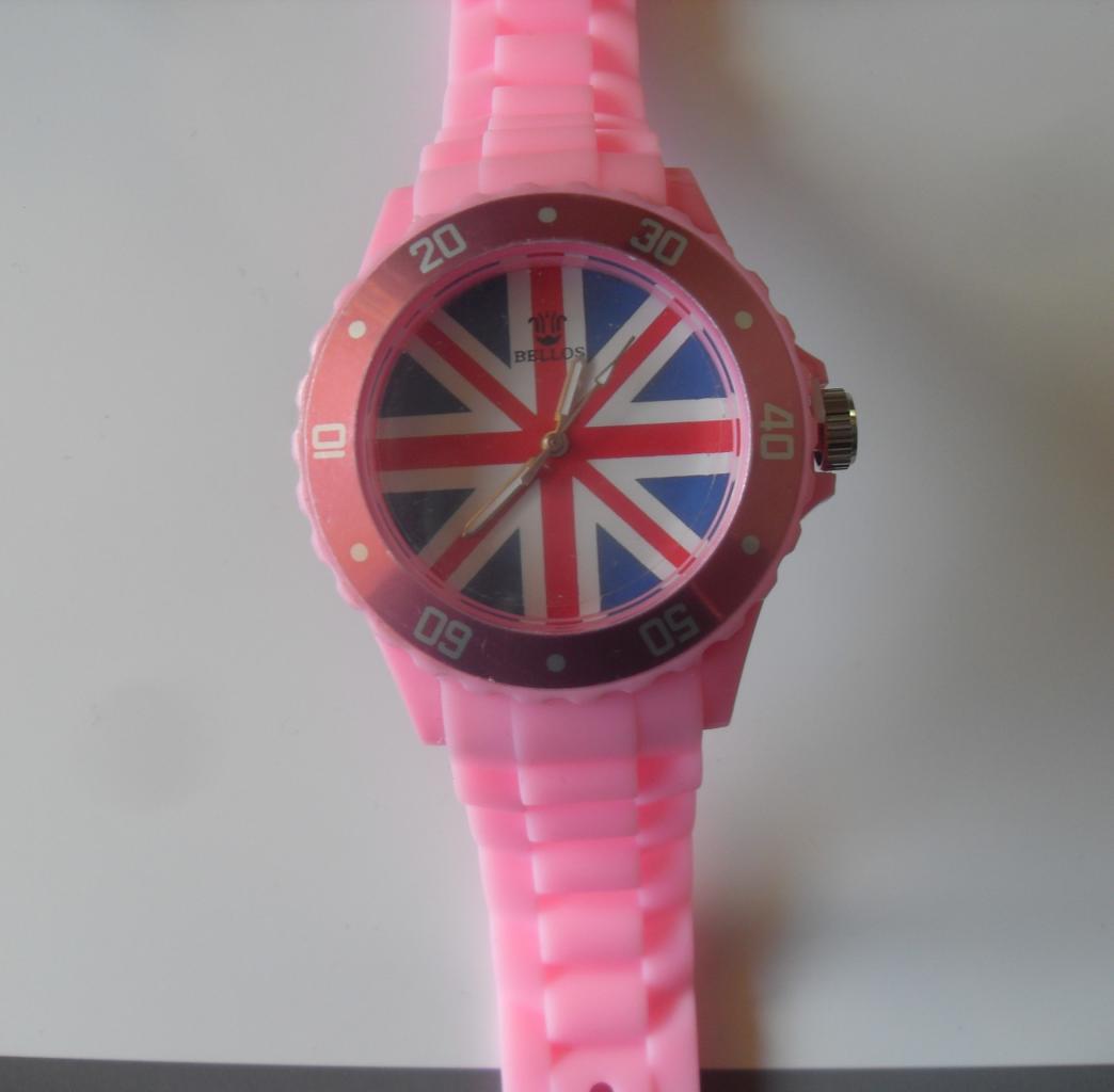Montre ronde rose à aiguilles, drapeau angleterre, et bracelet silicone.