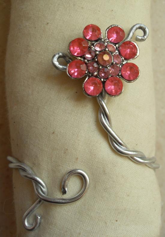 Parure en métal argenté et fleur strass rose. Création unique, idéal mariage.