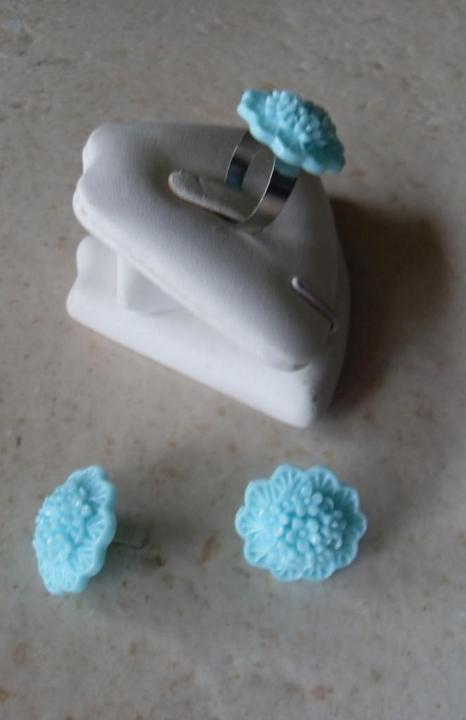 blanc métal argenté Parure bleu fleurs Bague made in France résine création unique boucles.