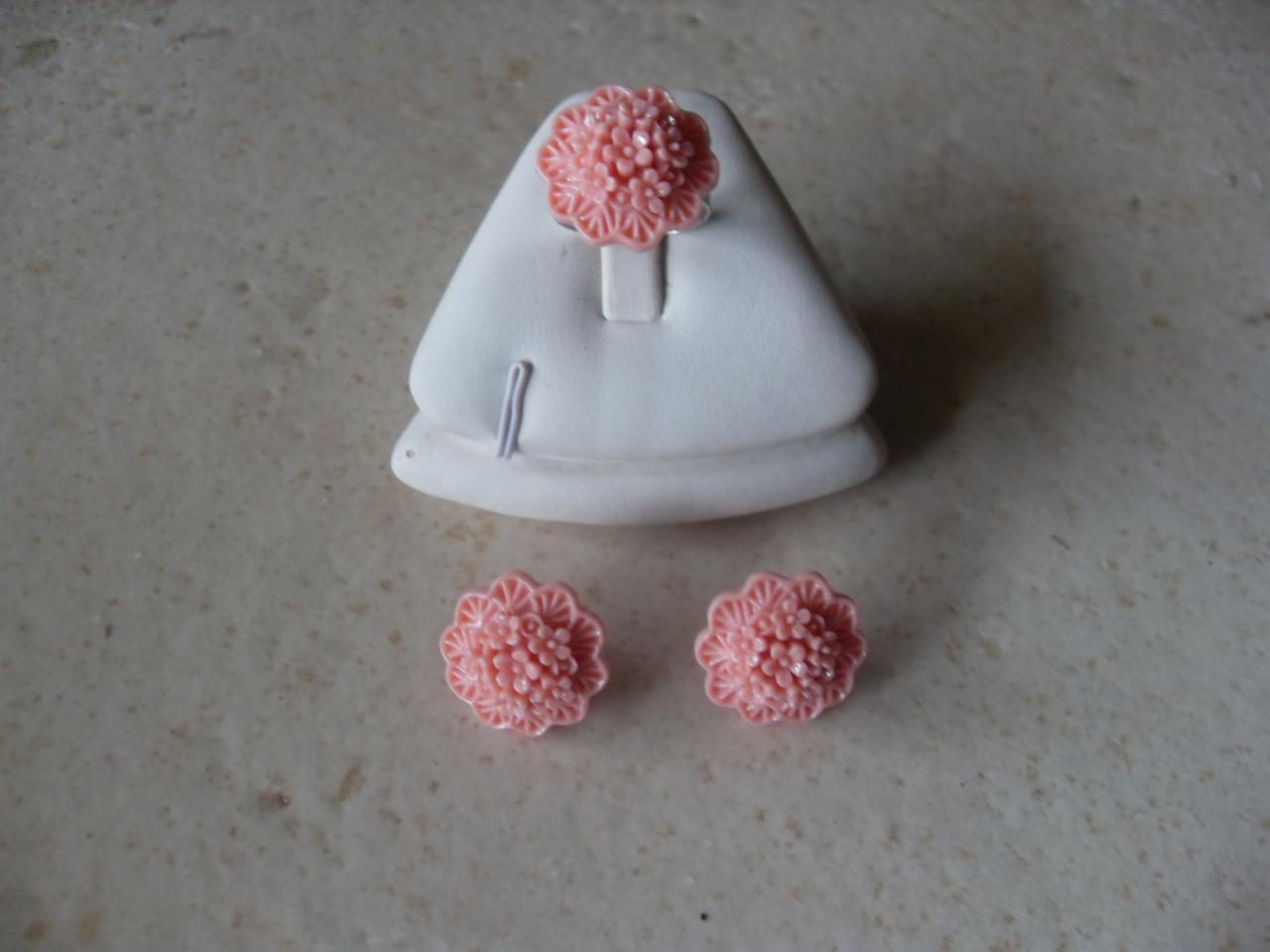 Parure fleurs rose résine et métal argenté, boucles et bague.