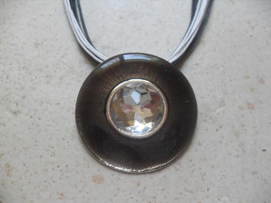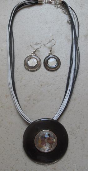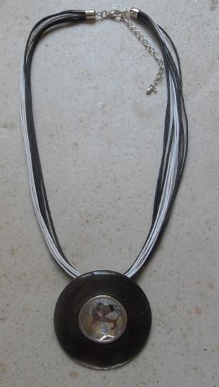 Parure collier cordons noir et blanc avec son pendentif rond et son strass blanc, fermoir mousqueton.