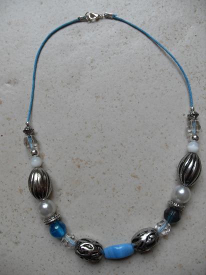 Collier en perles de verre, porcelaine, métal, résine et cristal de swarovski sur cordon en coton turquoise.