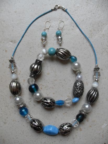 Parure blanche, argentée et turquoise.