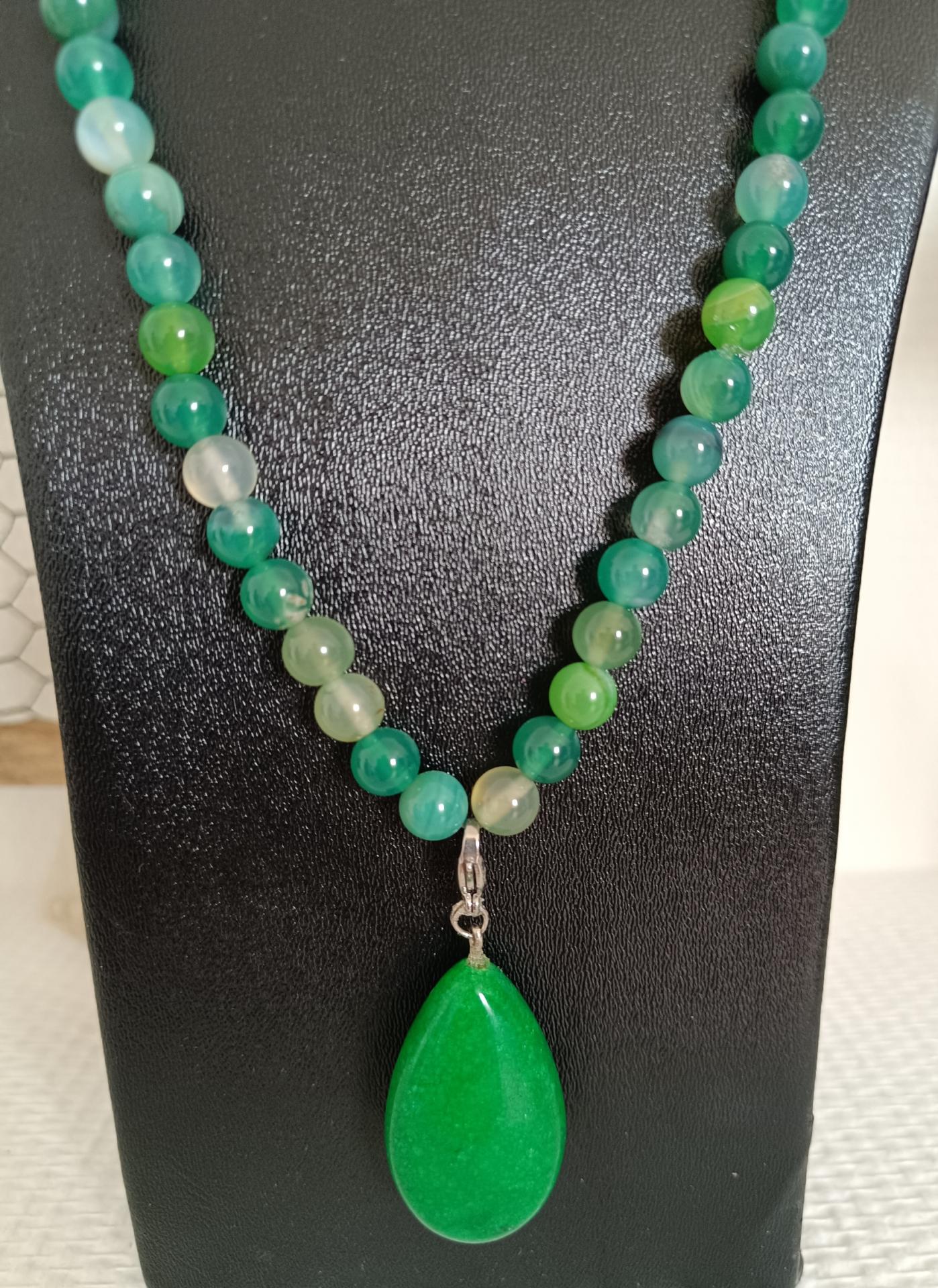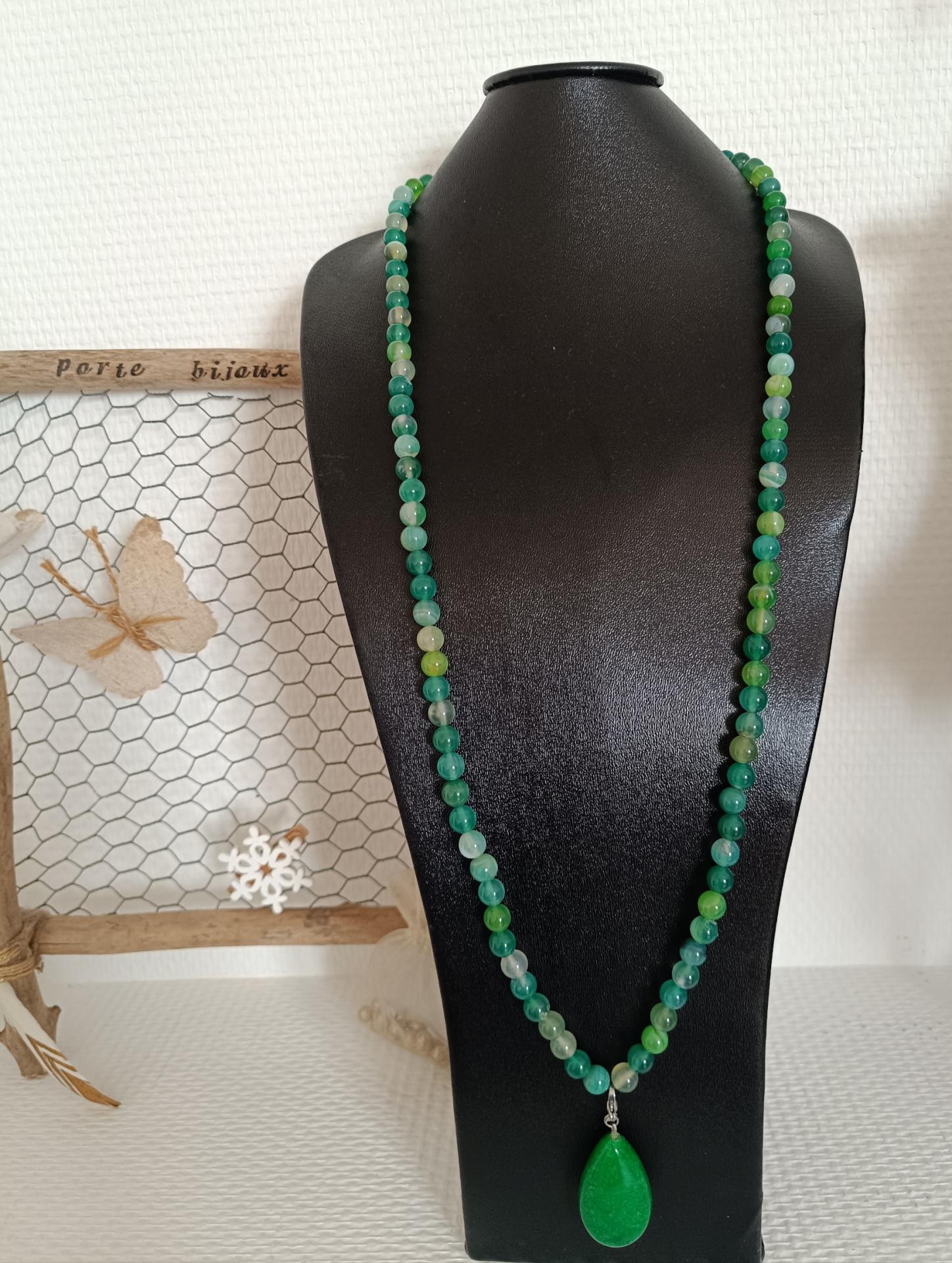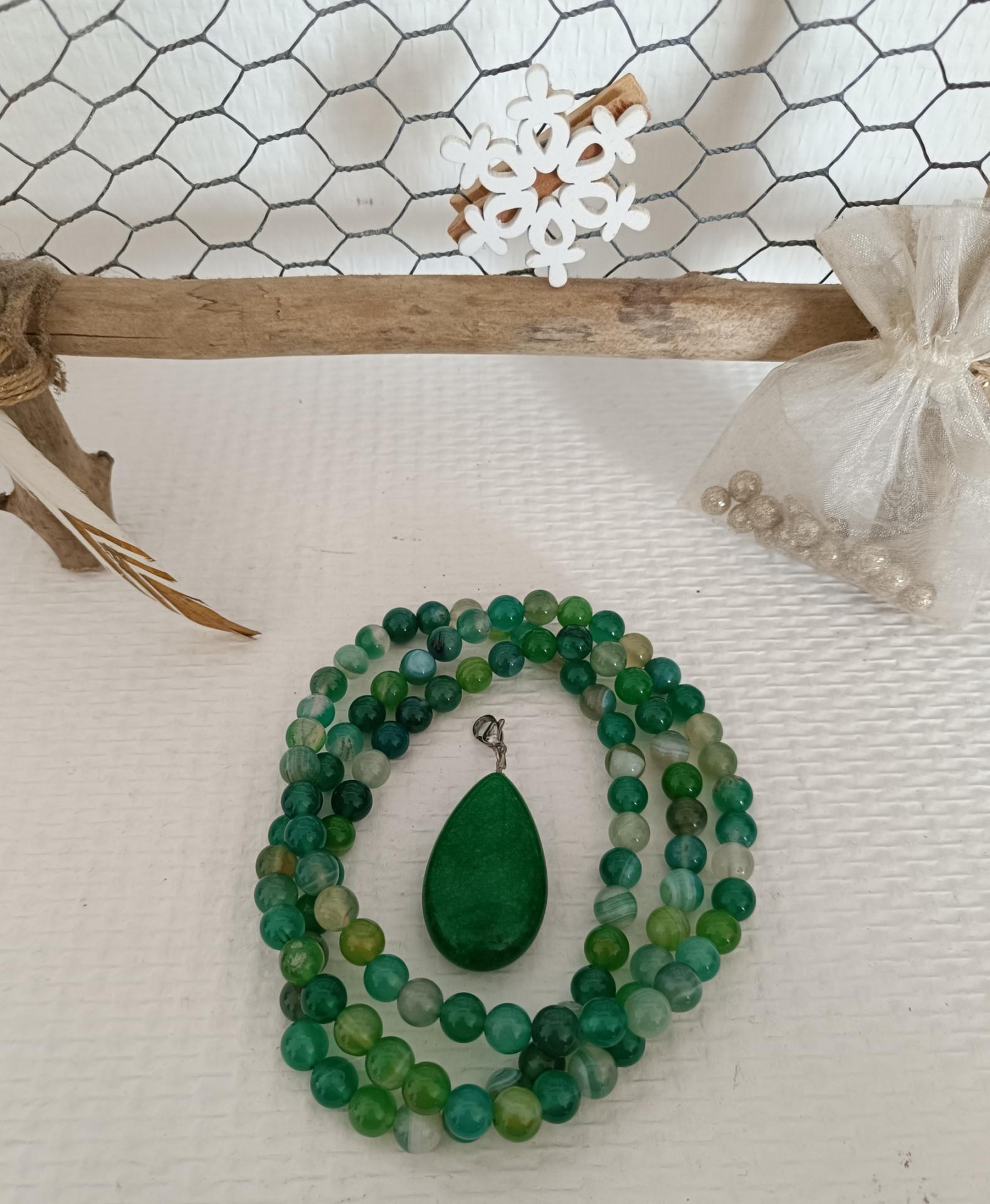 Sautoir agates vertes, pendentif aventurine, création artisanale.