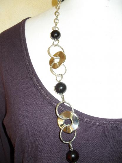 Sautoir cercles métal-perles et tresse noire.