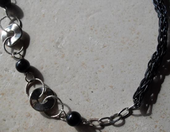 Sautoir chaîne et cercles en métal argenté avec perles noires et tresse de fil aluminium noir.