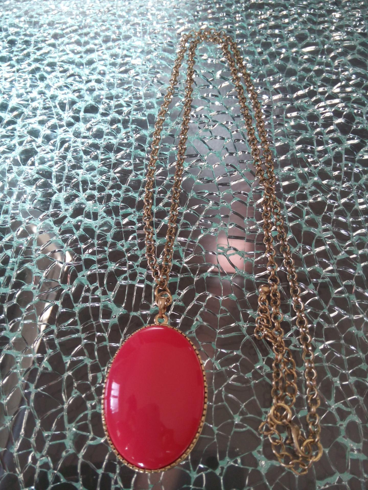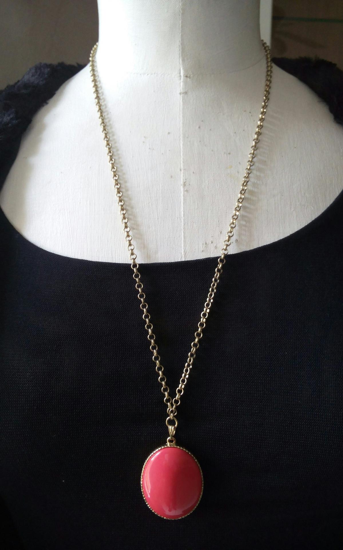 Sautoir chaîne maillons en métal et son pendentif cabochon ovale orange .