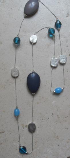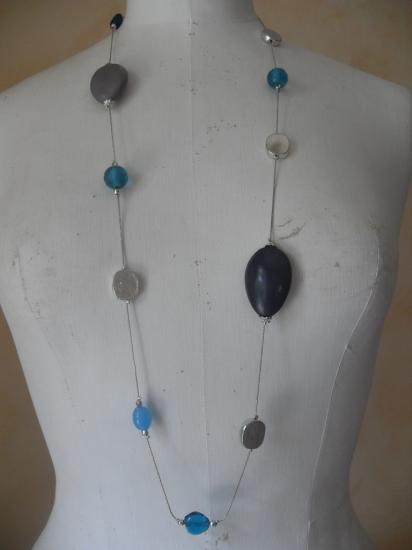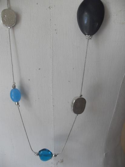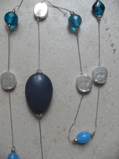 Sautoir chaîne fine en métal argenté, grosses perles ovales , perles de verre turquoise et perles métal argenté.