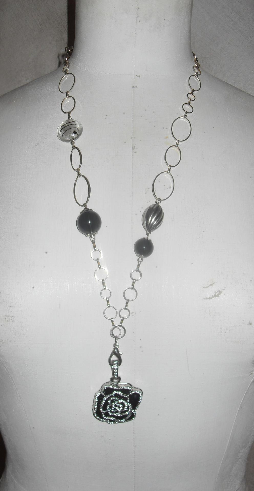 Sautoir en chaîne métal argenté, perles résine et verre et son pendentif fleur clé-usb 8gb en métal argenté et strass.