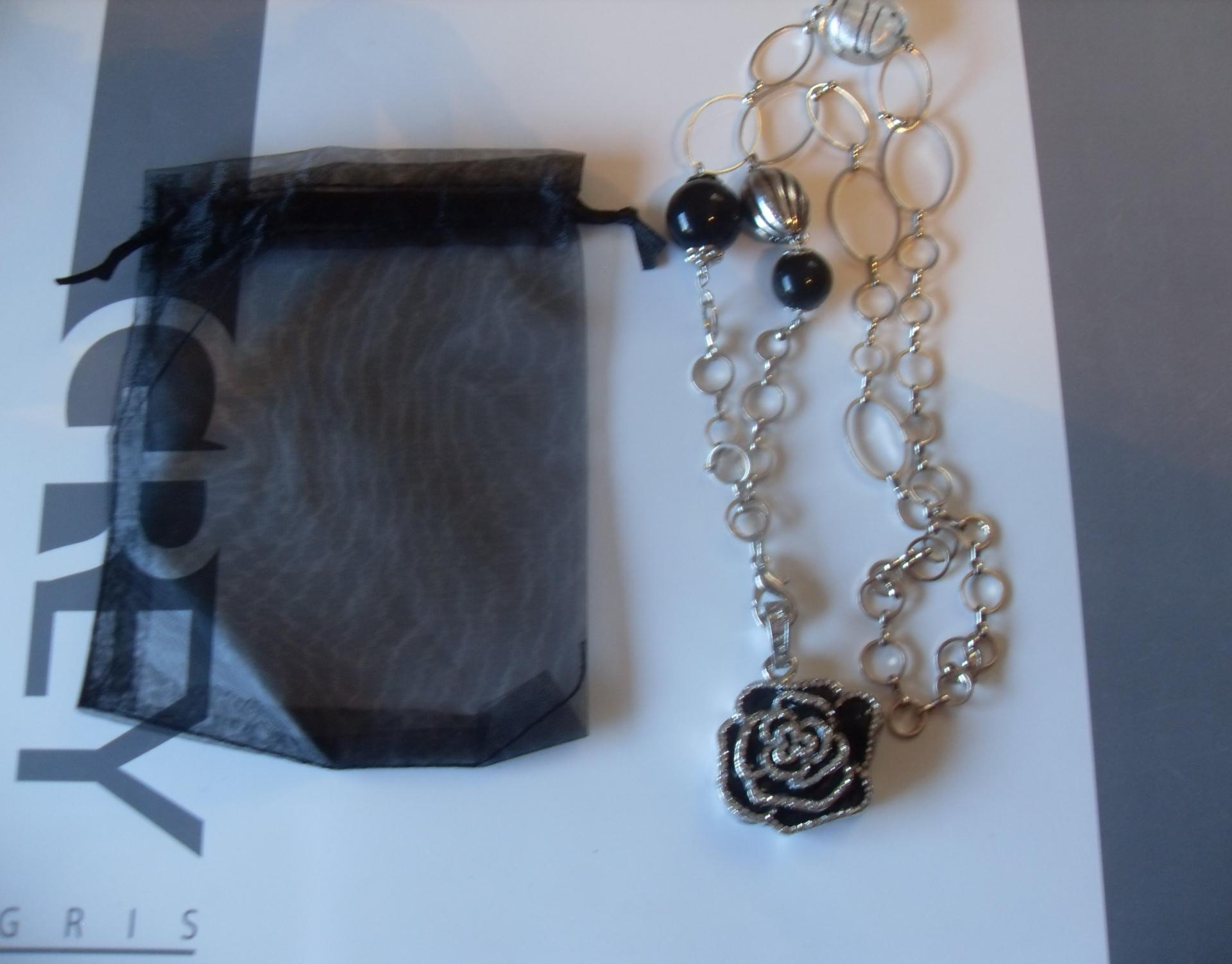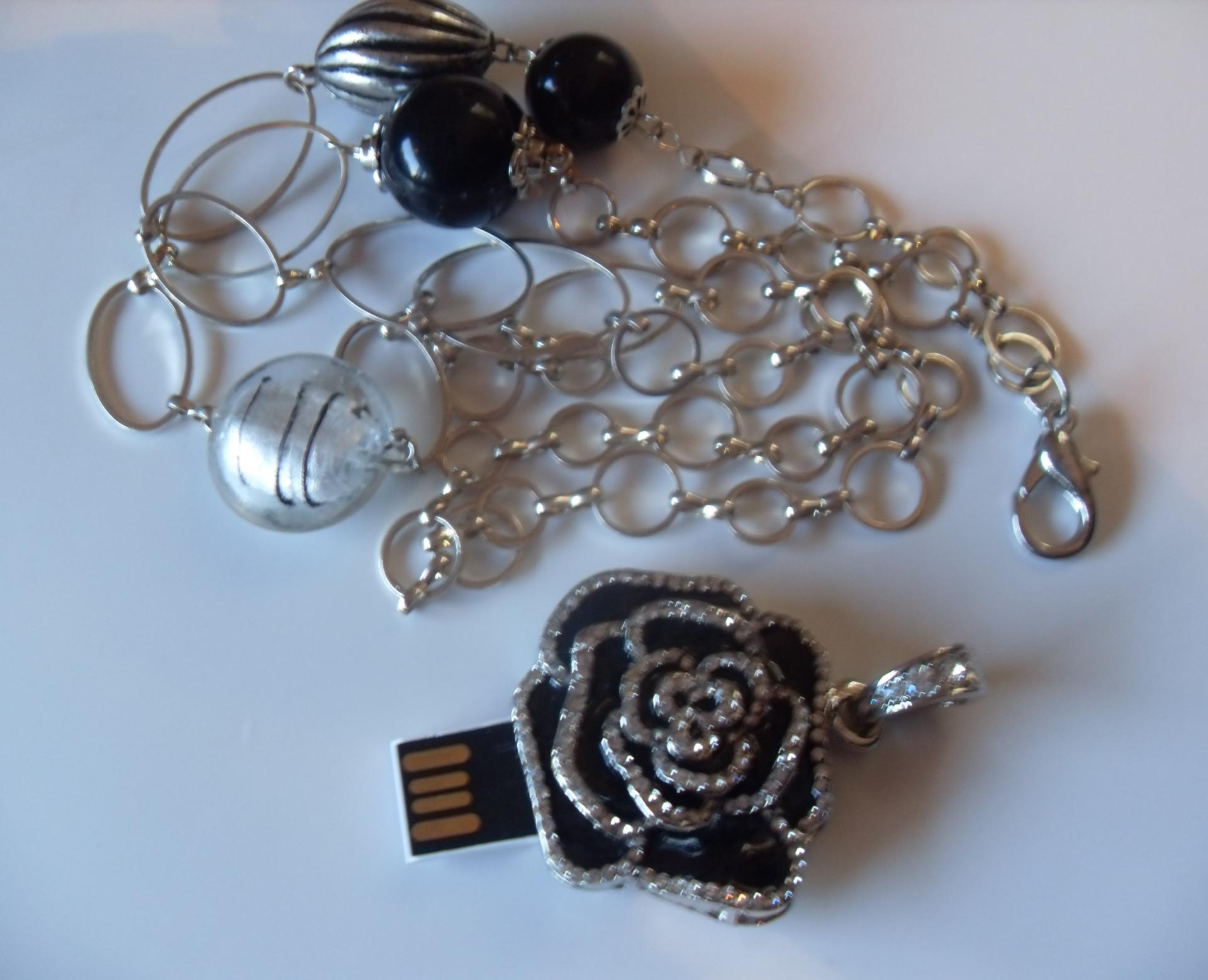 Sautoir clé-usb bijou, 8 gb, fleur noir métal et strass, perles verre, résine, création unique.