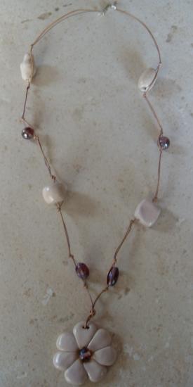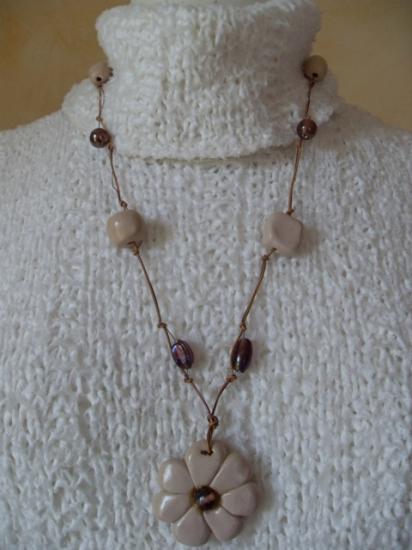 Sautoir avec cordon cuir, perles de verre mauve et perles en pâte fimo écru. Et son pendentif fleur en pâte fimo.