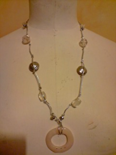 Sautoir avec son cordon argenté et perles acier et blanche et son pendentif en forme de cercle blanc avec strass. Fermoir acier dos.
