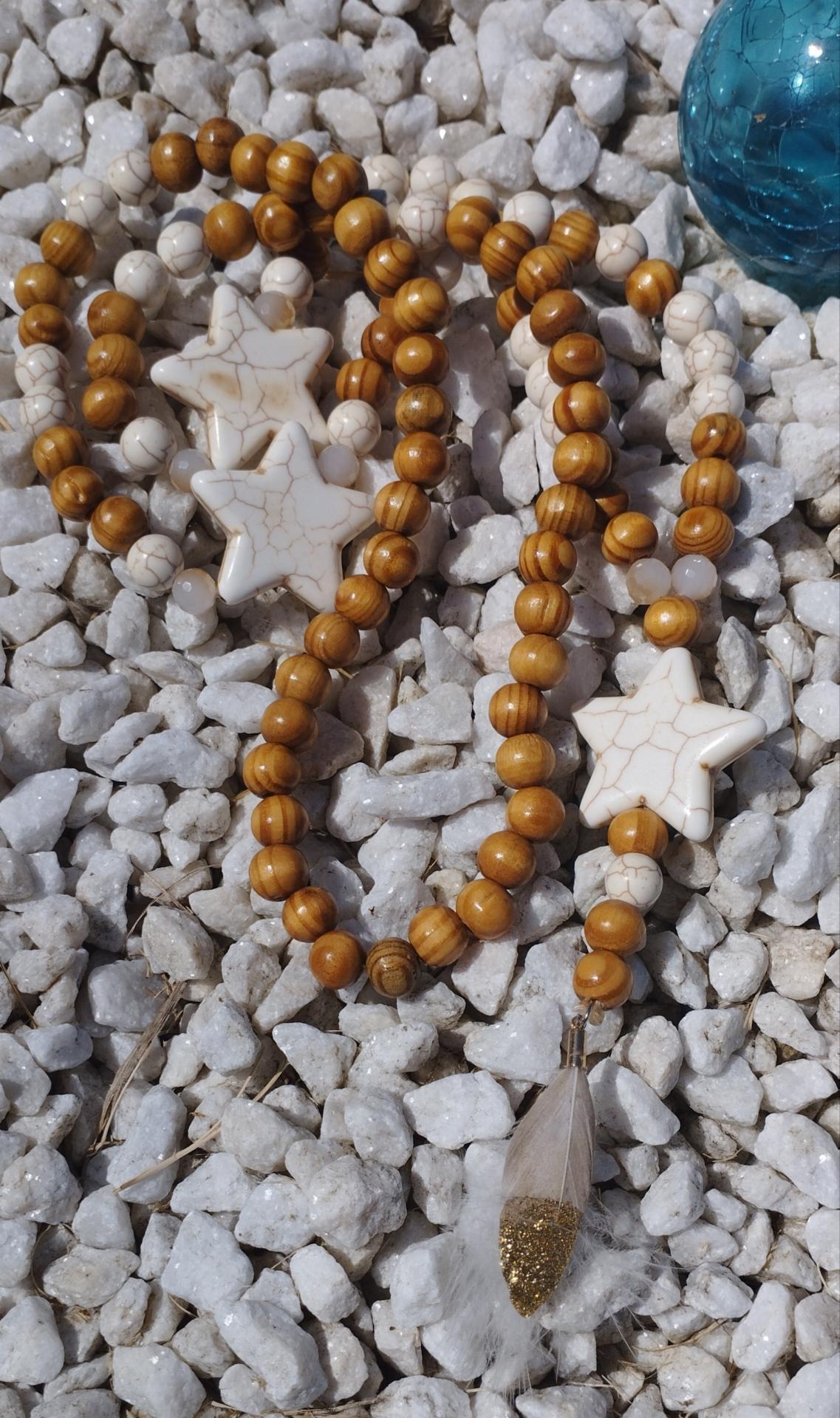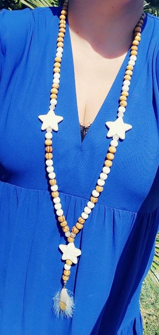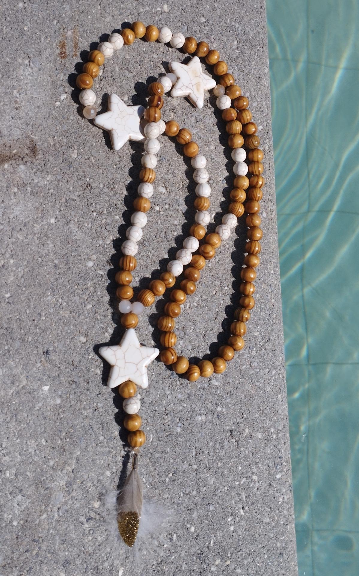 Sautoir perles bois et verre et ses étoiles, avec son pendentif étoile et plumes.