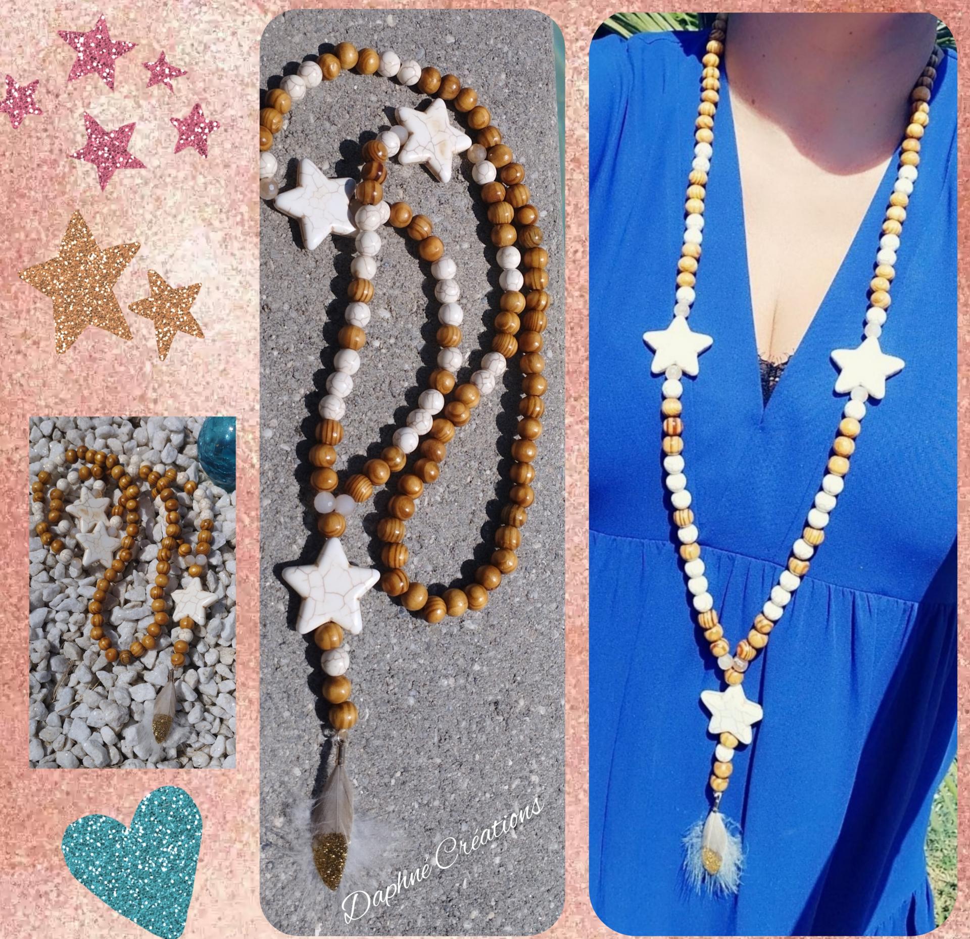 Collier pendentif Sautoir bois Daphné créations blanches bijoux chaînes étoiles acier inoxydable plumes pierres naturelles bien-être vertus