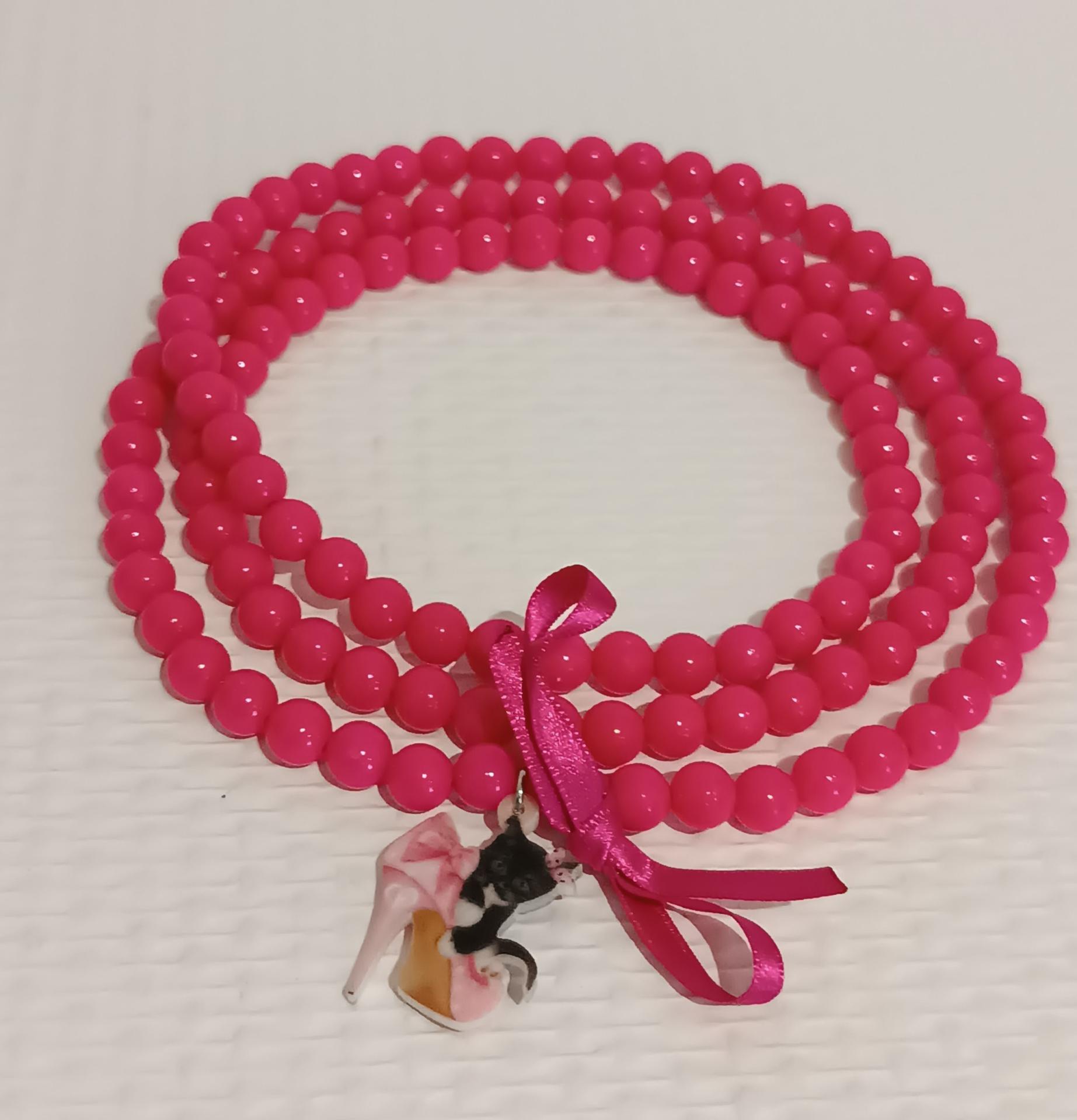 Bracelet en perles rose fushia et son escarpin et chaton, élastiqué. Daphné créations.22.90€ TTC