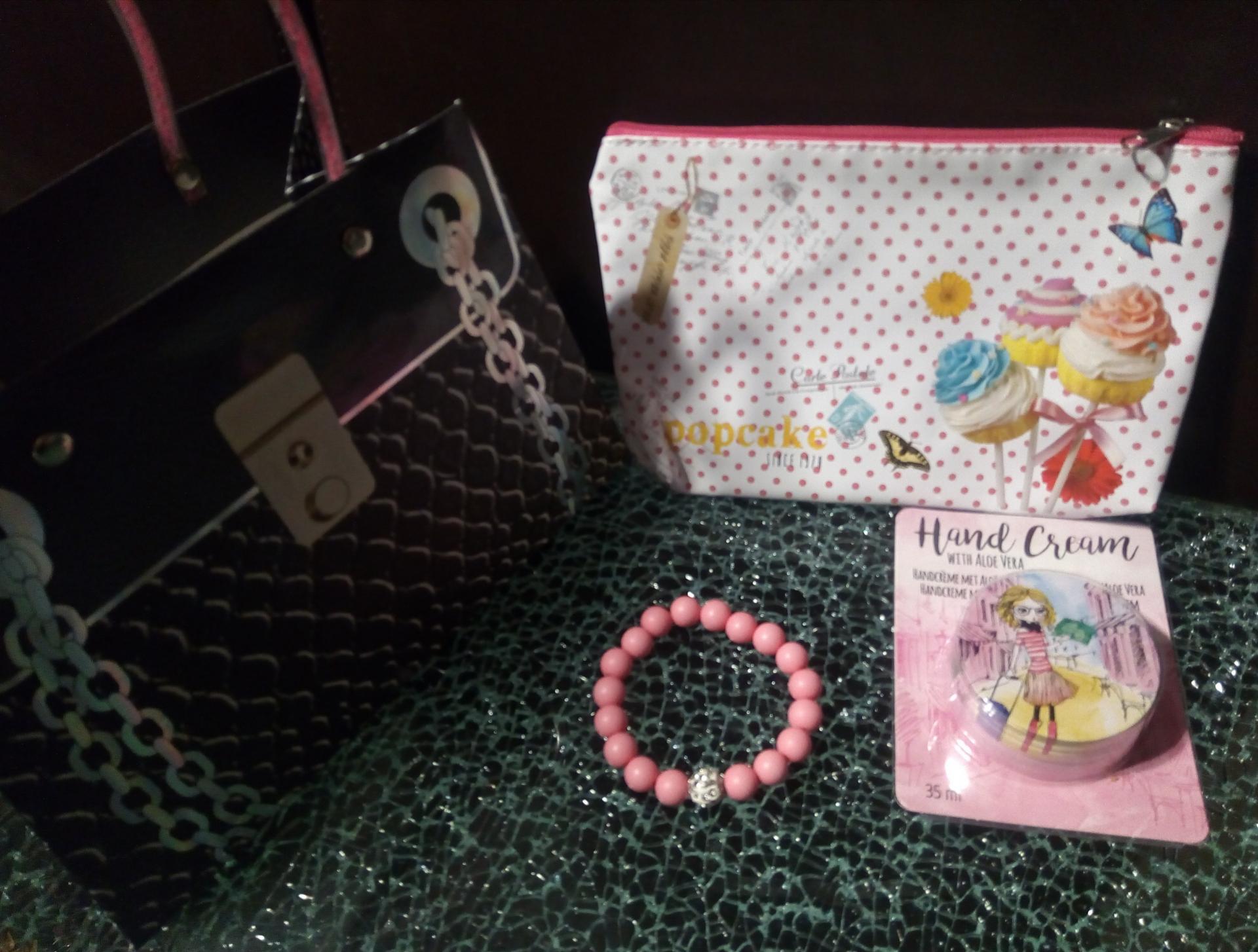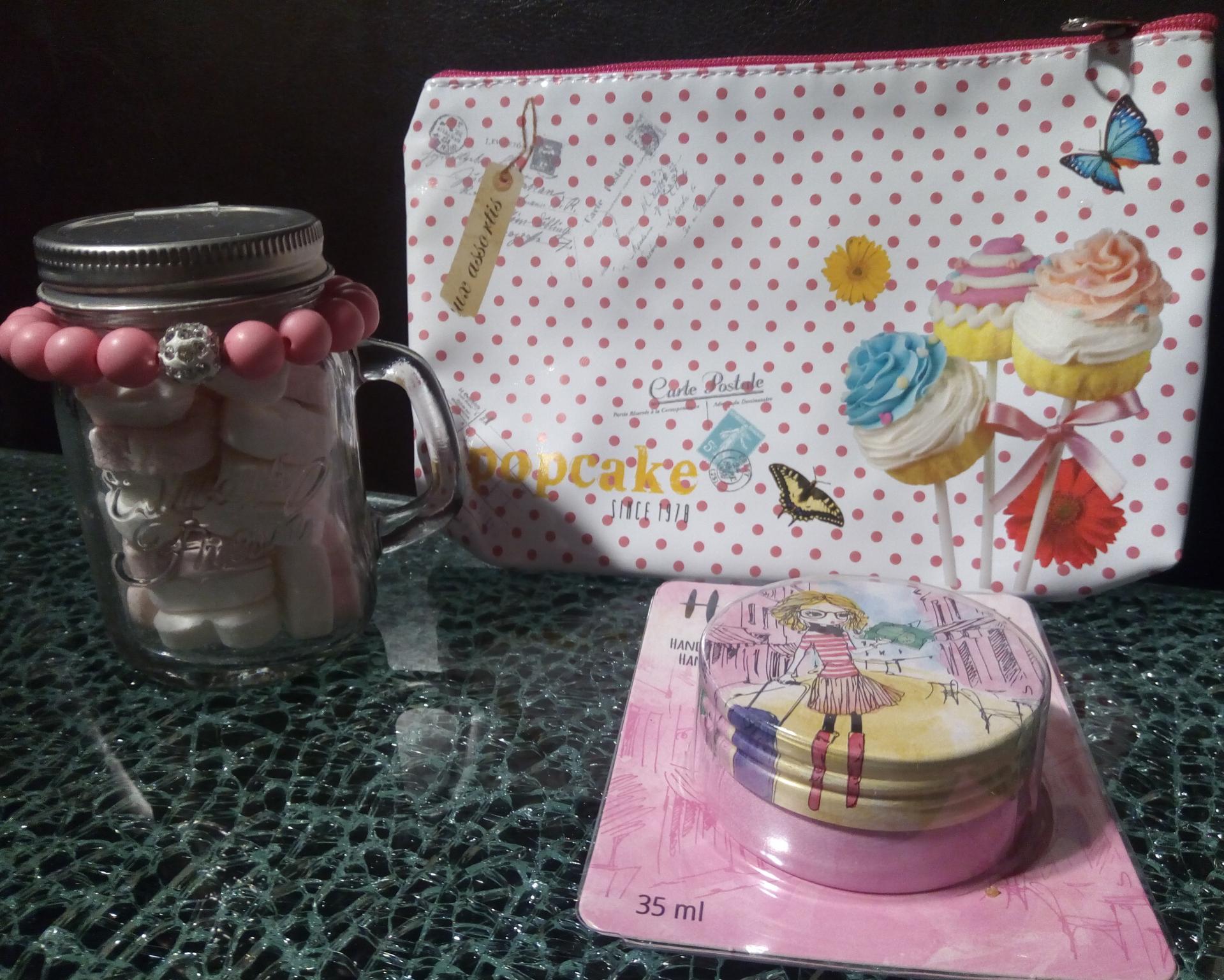 Coffret cadeaux gourmand, trousse, petite boutonnière, bracelet rose et baume mains.
