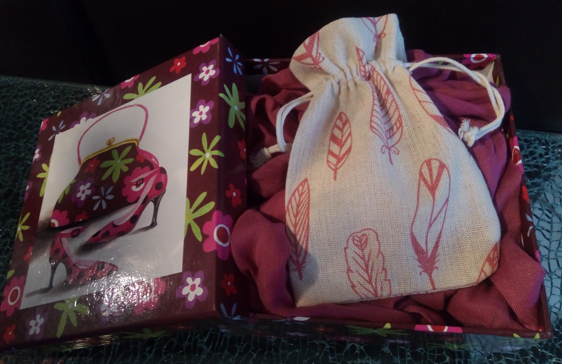 Boîte carton, marron et rose et motifs