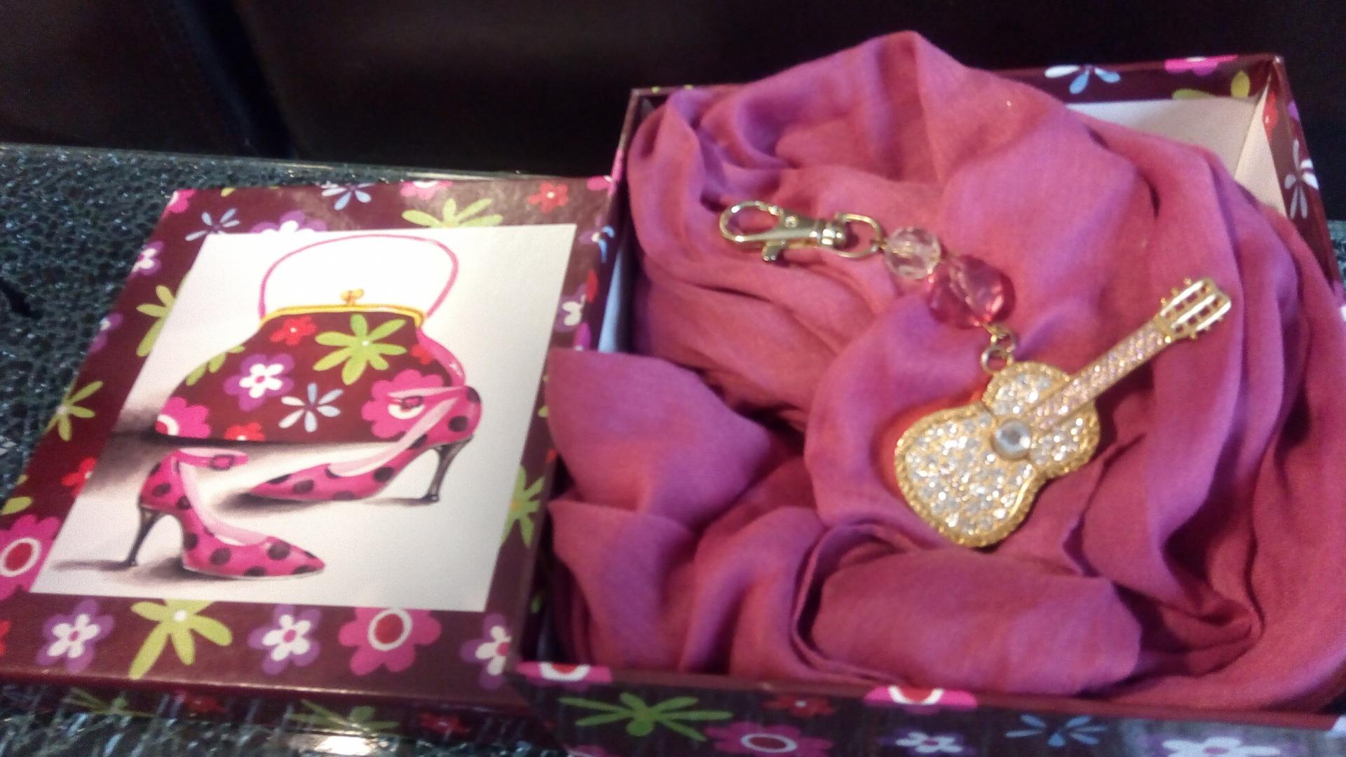 Coffret cadeaux marron-rose, son foulard snood rose et son bijou de sac, clé usb guitare.