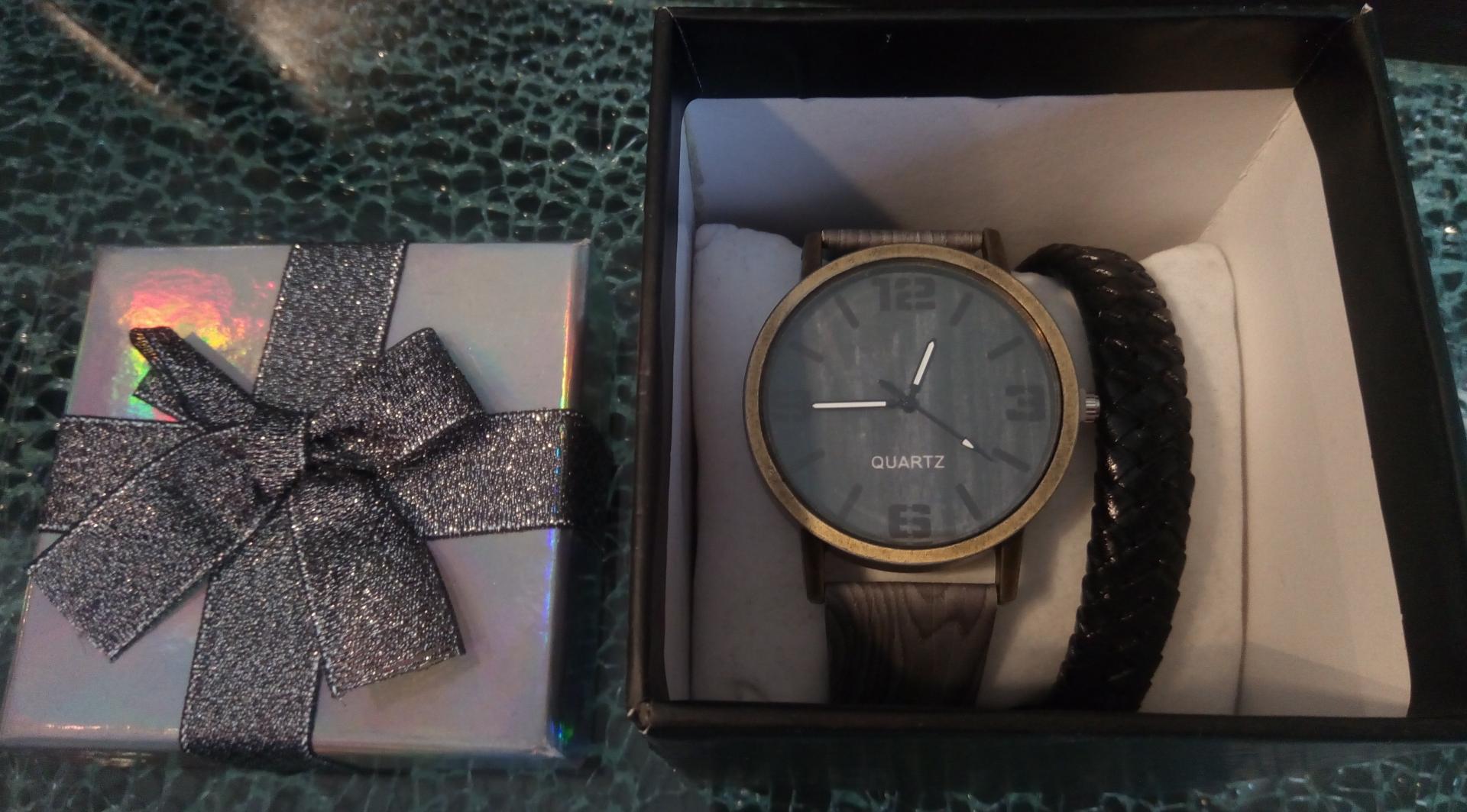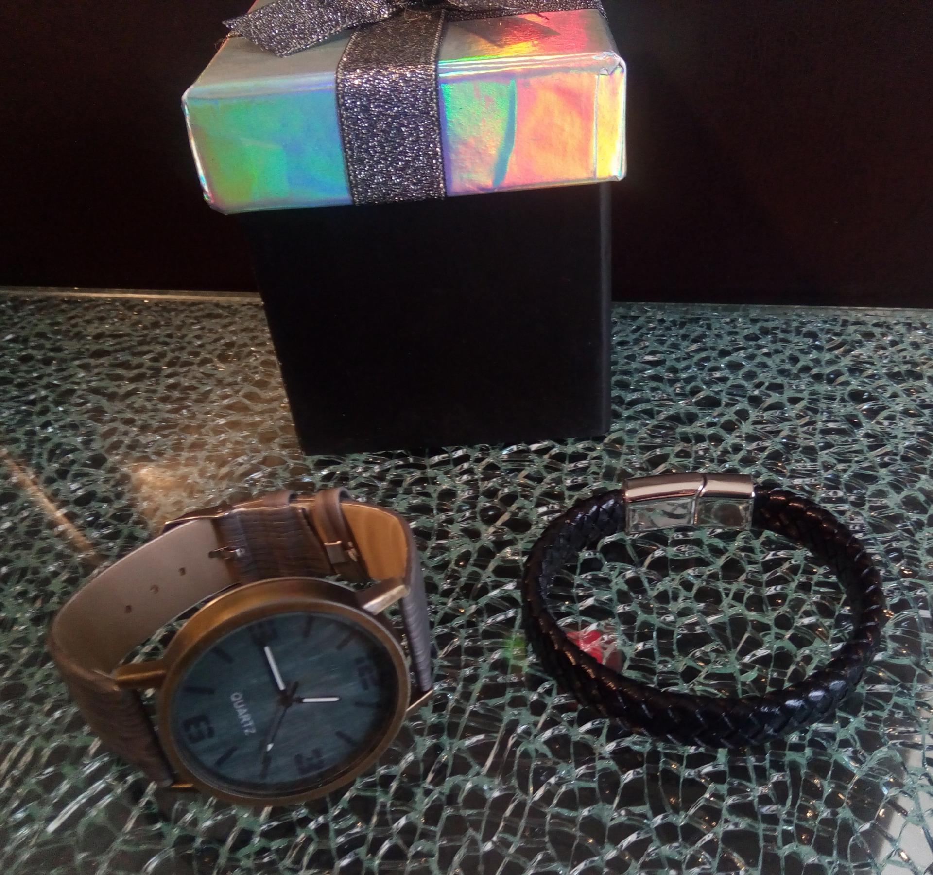 Coffret cadeaux noir-argent, montre et bracelet tressé noir.