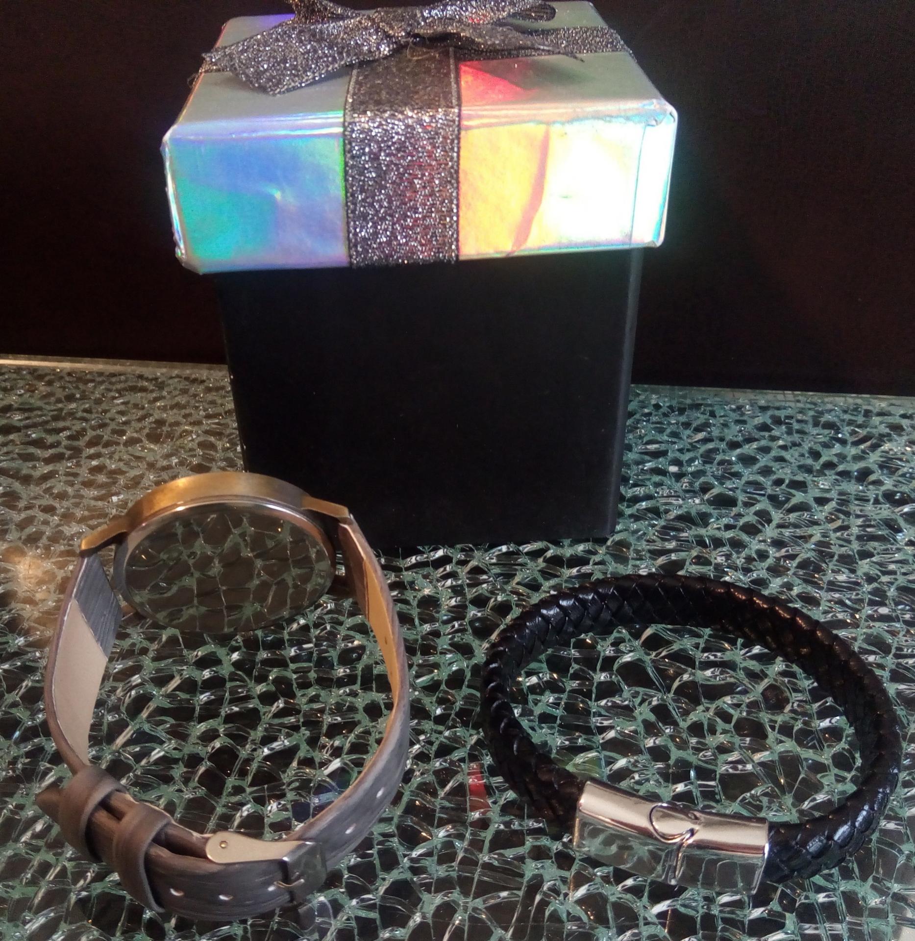 Coffret cadeaux noir-argent, montre grise et bracelet tressé noir.