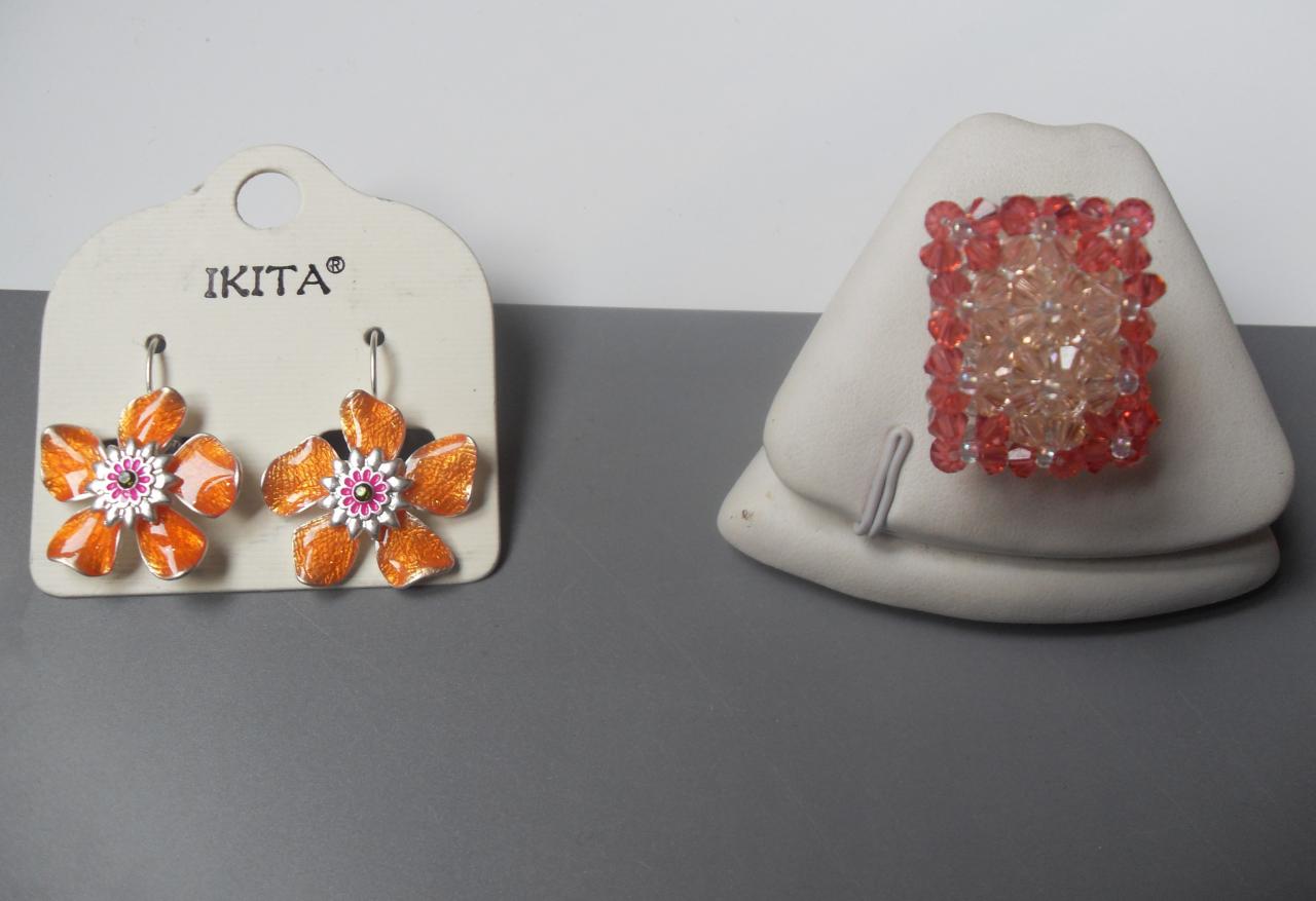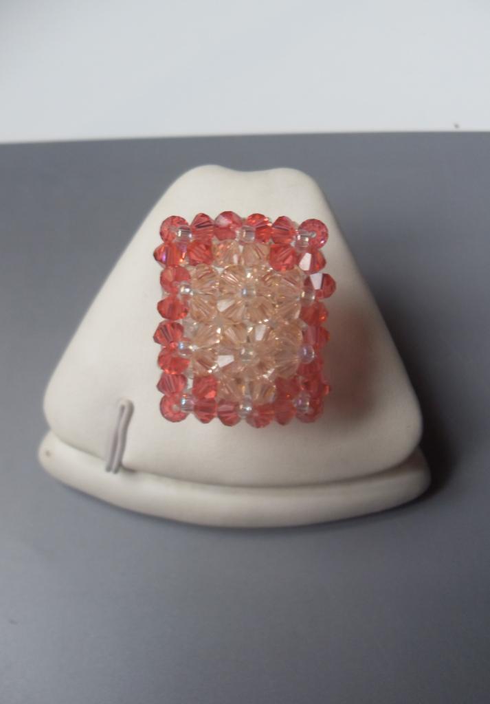 et une bague rectangle en cristal de swarovski dans les ton orangé.(Taille 54 à 58, légérement élastique grâce à son tour de doigt en perles et fil nylon.)