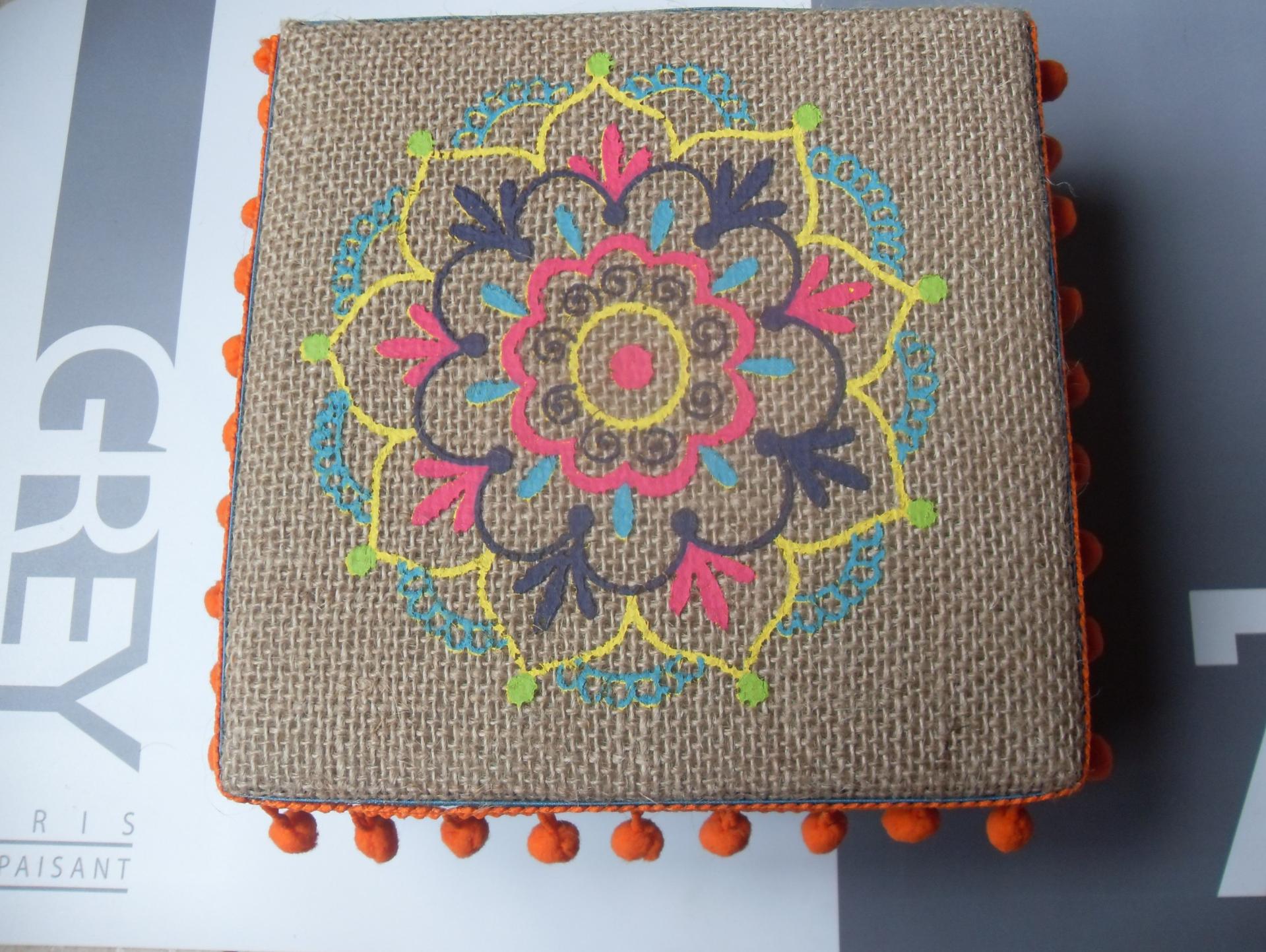 Boîte orange-bleu et ses pompons en tissu